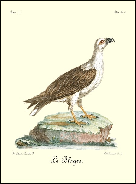 Le Blagre est en Afrique ce qu’est le balbusard en Europe. Modélé sur les mêmes proportions, il a aussi précisément les mêmes mœurs. Il fait sa principale nourriture de poisson, qu’il fixe du haut des airs, et qu’il saisit en se plongeant même entièrement dans l’eau. Perché sur un arbre, près d’une rivière ou d’un lac, ou sur quelque rocher qui borde la mer, il passe des matinées entières à y guetter les poissons qui se présentent à sa portée. On le trouve rarement dans l’intérieur des terres arides; il ne fréquente que les bords de la mer et des rivières poissonneuses. Il vole à une prodigieuse hauteur, d’où on l’entend pousser des cris très-aigus. Ces oiseaux paroissent avoir l’œil perçant; car je les ai vu descendre presque des nues tout droit sur des poissons qui nageoient à la surface de l’eau, et en emporter d’assez gros dans leurs serres. La chair du Blagre a un goût insipide de poisson, et sa graisse, qui est très-abondante, est si huileuse, qu’en écorchant l’oiseau, elle se répand sur toutes les plumes. Deux individus de cette espèce, que j’avois préparés avec le plus grand soin, ont été totalement gâtés, parce que cette graisse, avec le tems, s’est répandue sur chacune des plumes de ces oiseaux; de manière qu’elles s’en sont trouvées entièrement imbibées, comme si on avoit trempé la peau dans de l’huile.