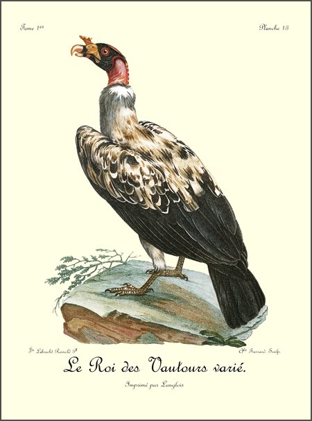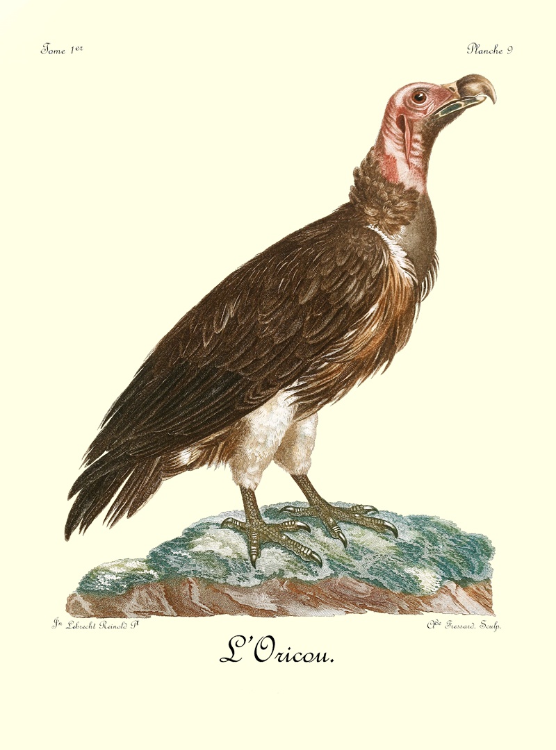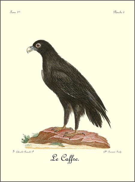 Tout le plumage du Caffre est d’un noir mat, à l’exception de quelques reflets brunâtres dans les petites couvertures des aîles, vers les pennes de l’aîle. L’œil, qui est très-grand, s’enfonce profondément dans l’orbite; et l’iris est d’un brun maron. Le bec est bleuâtre à sa base, et jaunâtre dans toute la partie de sa courbure. Les ongles sont noirs et les doigts d’un jaune terne. Je n’ai rencontré ces oiseaux que dans le voisinage de la Caffrerie, où ils sont même assez rares. Je n’ai vu en tout que cinq individus de cette espèce, du nombre desquels il ne m’a été possible d’en tuer que deux, qui vinrent se précipiter sur les débris d’un buffle, que j’avois fait jeter à l’écart pour les attirer. En les écorchant, il s’exhala de leurs corps une odeur insupportable; ce qui prouve qu’ils font leur principale nourriture des cadavres qu’ils rencontrent. Comme les vautours, ils sont obligés de marcher quelques pas avant de pouvoir s’enlever de terre; mais ils ne volent point en grandes troupes, car je ne les ai jamais vu que deux ensemble, apparemment le mâle et la femelle. N’ayant tué que deux femelles, je ne puis indiquer la différence qui se trouve entre les deux sexes. Je n’ai pu rien apprendre de particulier sur leurs habitudes et leurs pontes; les Sauvages m’ont assuré seulement qu’ils nichent dans les rochers; qu’ils attaquent les agneaux, les dévorent sur la place, et que jamais ils n’emportent leur proie dans leurs griffes, même quand ils ont des petits. Nous savons que l’aigle porte, de cette manière, la sienne dans son aire, pour la déchirer et la partager ensuite à ses aiglons. Le vautour, au contraire, n’apporte à ses petits leur nourriture que dans son jabot, d’où il la dégorge ensuite. Voilà du moins 30 une observation que j’ai faite plusieurs fois sur l’espèce que les colons du Cap nomment stront-vogel (oiseau de merde), ou aas-vogel (oiseau de charogne). Il y a même lieu de croire que c’est là généralement l’usage de tous les vautours; car leurs griffes ne sont pas propres à empoigner ni à serrer fortement.