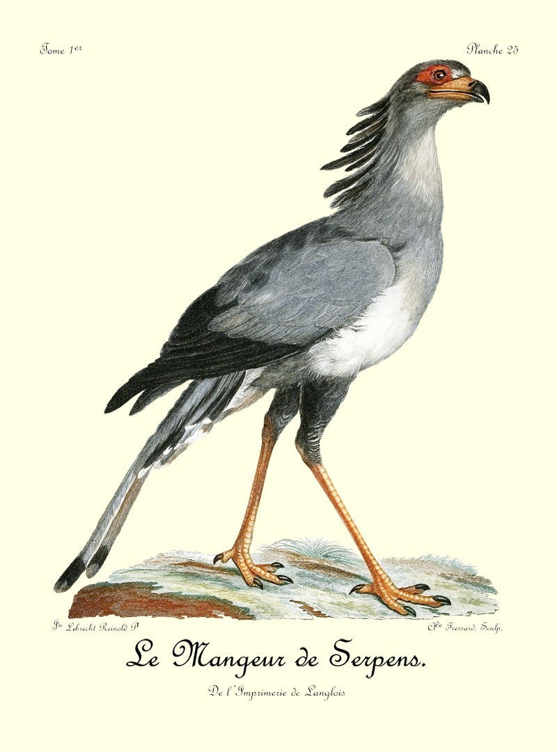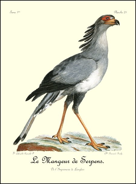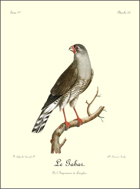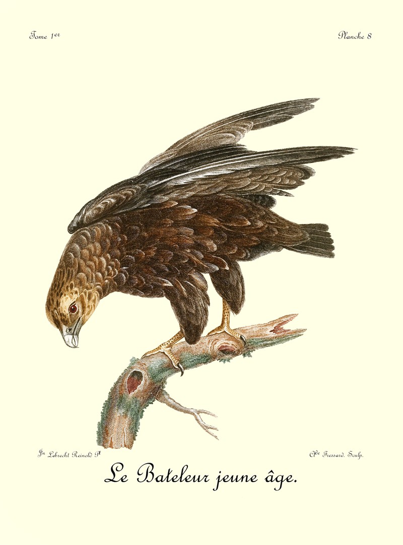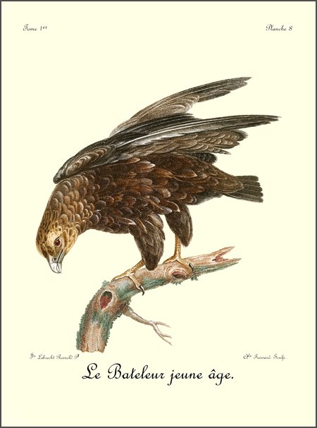 Le canton où j’ai vu le plus communément le Bateleur est celui où j’étois campé sur les bords du Queur-Boom, proche la baie Lagoa. Ils ne volent point en troupe, et on n’en voit plusieurs ensemble que lorsqu’un concours d’autres oiseaux de proie a attiré tous ceux du canton sur quelques cadavres. Dans ce seul cas, on les trouve rassemblés; mais quand ils sont 35 repus, chaque couple prend une route différente pour se rendre dans leurs retraites respectives, et s’enfoncer dans les montagnes voisines ou dans les différens quartiers de la forêt, où ils ont établi leur demeure.