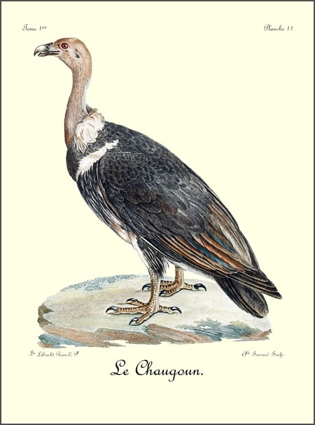 Il arrive souvent que des bandes de vautours et de corbeaux, se réunissant, cherchent à saisir le moment favorable pour s’emparer de l’animal que vient d’abattre le Griffard; mais la contenance intrépide et fière de cet oiseau posé sur sa proie, suffit pour tenir à l’écart cette légion de carnivores.