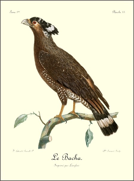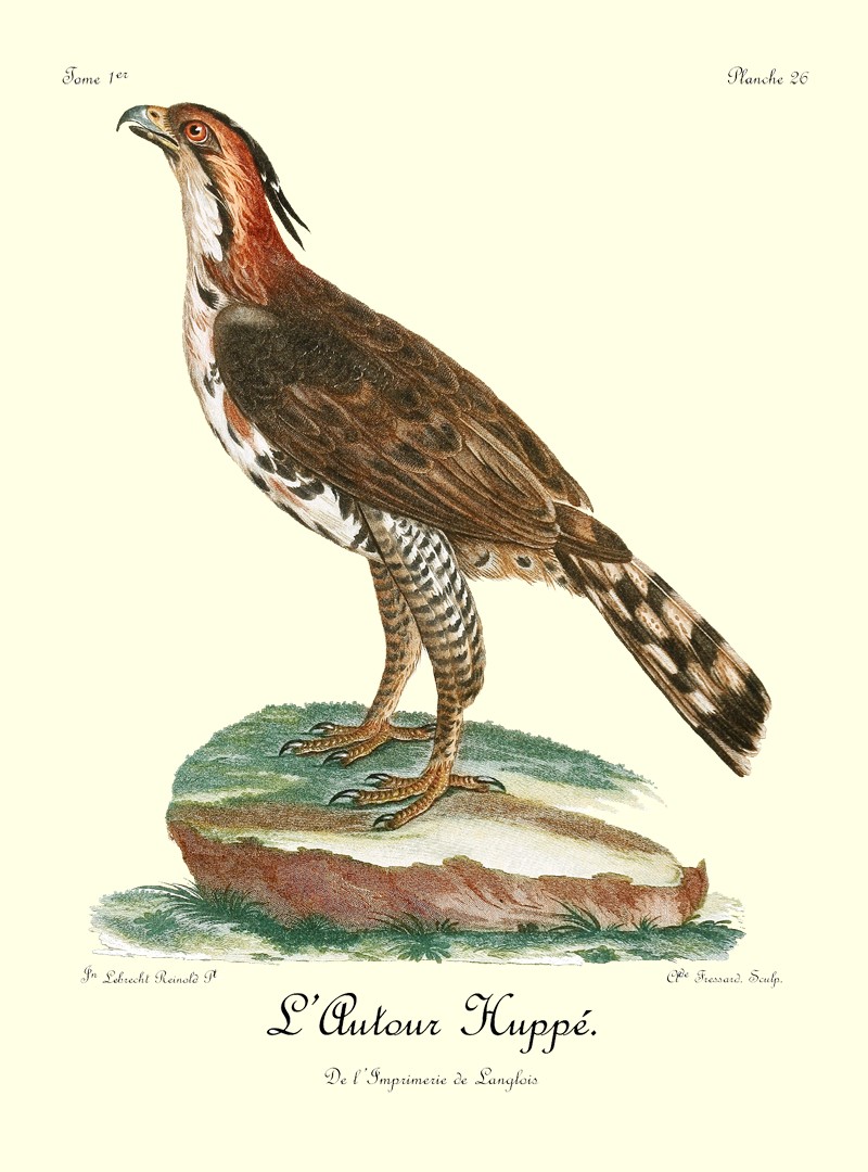J’ai tiré la dénomination de cet aigle de l’espèce de huppe qui le caractérise si bien. Cette touffe de plumes prend naissance sur l’occiput, se prolonge de cinq à six pouces par derrière, et descend avec grâce, en se courbant un peu vers le corps; elle est si flexible et si légère, que le plus petit vent ou le moindre mouvement de l’oiseau suffit pour la faire jouer en tout sens; ce qui lui prête une grâce toute particulière, en donnant à cette panache mille formes différentes, qui ajoutent encore à son agrément celui de varier à l’infini cet ornement de tête; parure que nos femmes ont si bien su imiter.