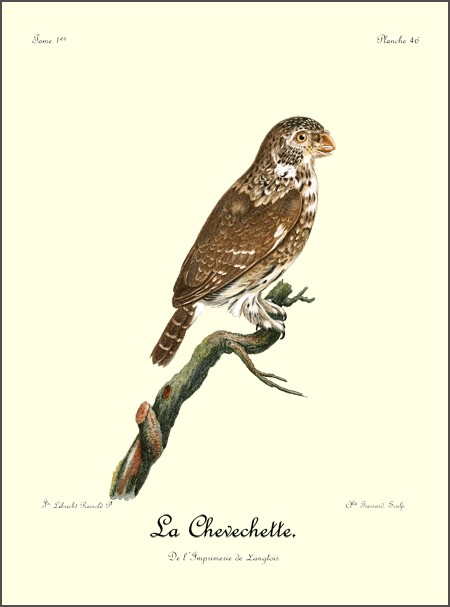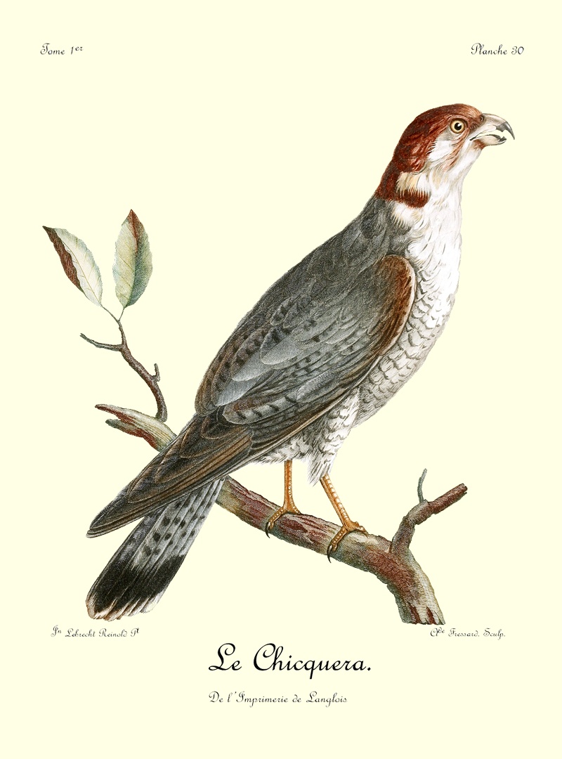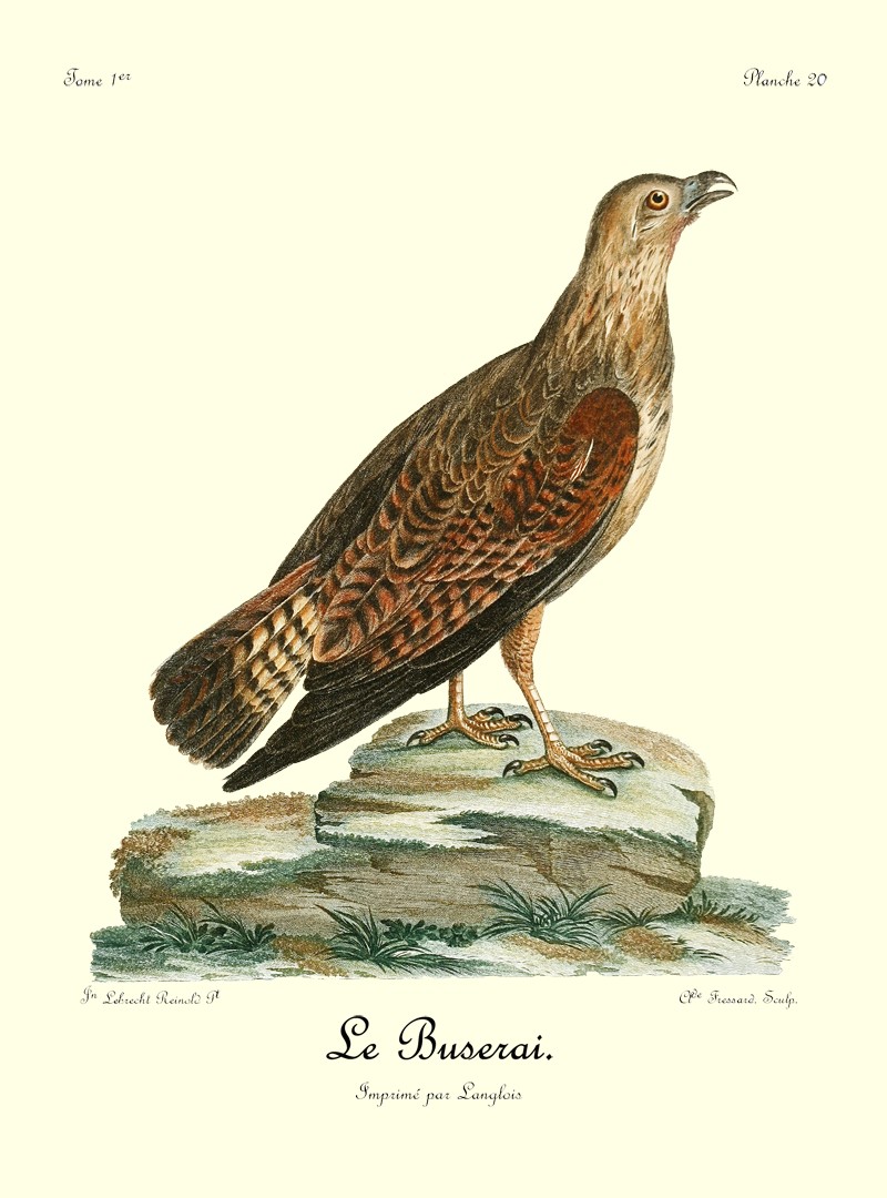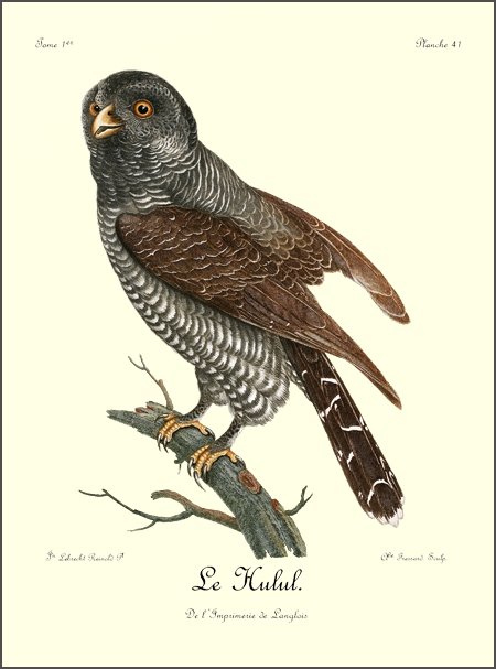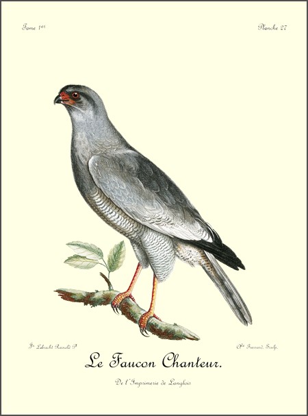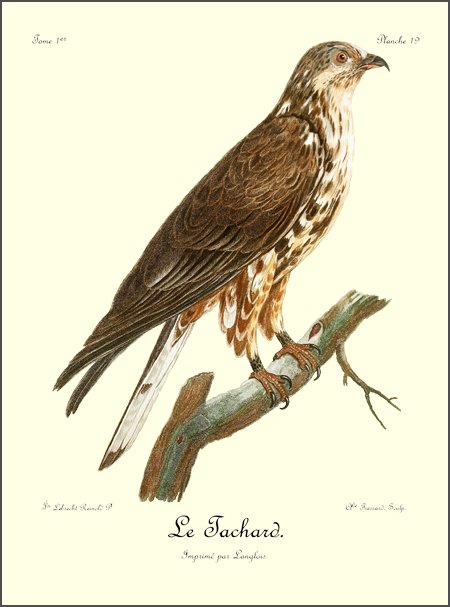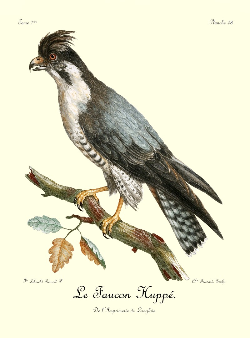 Comme le griffard, le petit aigle, dont il est ici question, est caractérisé par une huppe, mais qui est beaucoup plus allongée; ses pieds sont de même couverts d’un fin duvet, qui s’étend jusqu’à la naissance des doigts; son bec crochu, ses ongles fortement arqués et bien affilés, annoncent un oiseau de guerre et de destruction, quoique sa taille ne surpasse guère celle de nos plus fortes buses. N’ayant pas assez de force pour saisir et abattre les gazelles, le Huppard se contente du menu gibier, tels que lièvres, canards et perdrix, qu’il chasse avec dextérité. Ses longues aîles, dont la pointe s’étend presqu’aussi loin que le bout 9 de la queue, lui servent merveilleusement bien pour s’élancer avec promptitude et saisir avec succès des oiseaux dont le vol est aussi rapide que celui des perdrix d’Afrique.