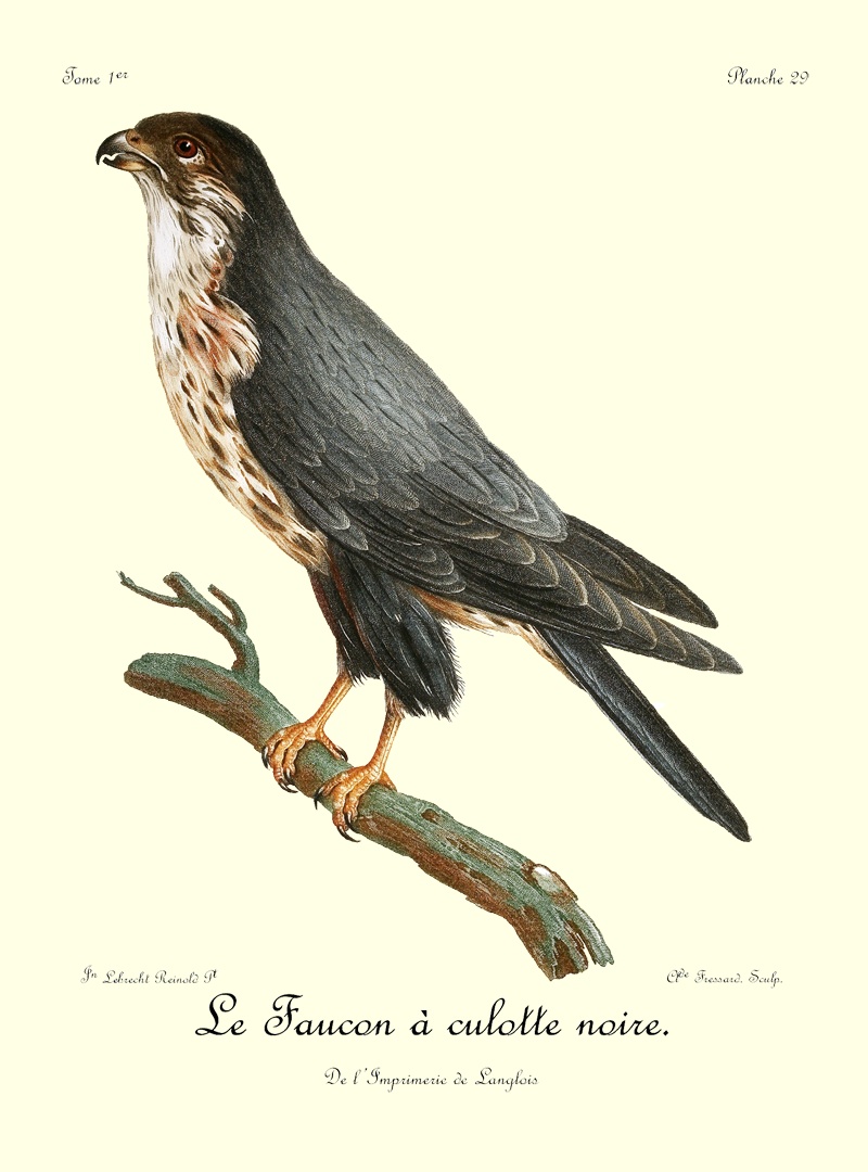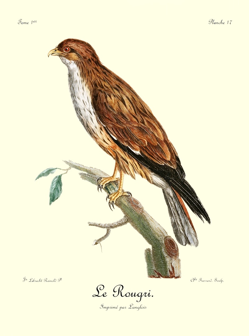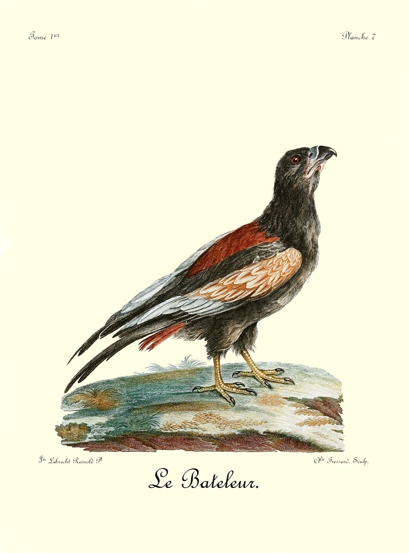 Si la queue très-courte de cet oiseau le distingue des autres oiseaux de proie, ses couleurs très-marquées aideront encore à ne pas le faire confondre avec d’autres espèces voisines. Le Bateleur est d’une grosseur mitoyenne entre l’orfraie et notre balbusard. Son bec et ses serres sont noires; la base du bec est jaunâtre; les pieds sont d’un brun jaunâtre, couverts de larges écailles; la tête, le cou, tout le devant et le dessous du corps sont d’un beau noir mat, sur lequel tranche fortement la couleur d’un roux foncé, qui est celle du dos et de la queue; les scapulaires sont d’un noir lavé, prenant, à certain jour, une teinte d’un gris bleuâtre; toutes les petites couvertures des aîles sont d’un fauve isabelle; toutes les pennes de l’aîle sont noires dans leurs barbes intérieures, et sont liserées extérieurement 33 d’un gris argentin; de manière que quand l’aîle est ployée, elle paroît en grande partie être de cette dernière couleur. L’œil est d’un brun foncé. La femelle est d’un quart plus forte que le mâle, et ses couleurs ont, en général, un ton plus foible.