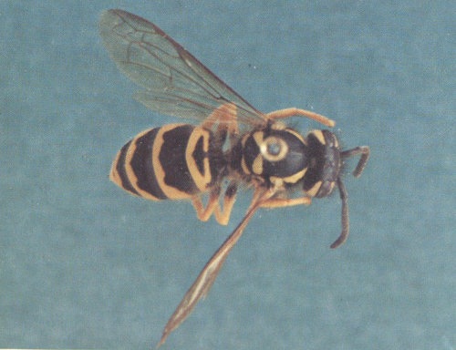 Identification. This information applies to all dangerous wasps found in the United States except the mutillids (previously discussed). Wasps are elongate insects with three distinct body parts and four wings. As with all winged forms of Hymenoptera, the front pair of wings is larger than the hind pair. Only the female wasps are equipped with a stinger at the posterior end of the abdomen. To distinguish wasps from similar-appearing bees, the specimen’s thoracic hairs should be examined microscopically to determine if they are smooth (a wasp) or feathered (a bee). In the United States, members of the paper-wasp family (Vespidae) are generally considered to be the most dangerous because of their social nesting habits, aggressive behavior, and abundance. Two representative members of the Vespidae family found in North America are the bald-faced hornet, Vespula maculata, and a common yellow jacket, V. pennsylvanica. Although it takes an expert to identify most wasps according to species, the paperlike nests of the vespids make their identification easy. Another important group of dangerous wasps easily distinguished by their nests are the mud daubers. These wasps usually build their mud nests in the corners of man-made structures. Besides their distinctive nests, mud daubers are identified by their dark shiny color and long narrow waist.