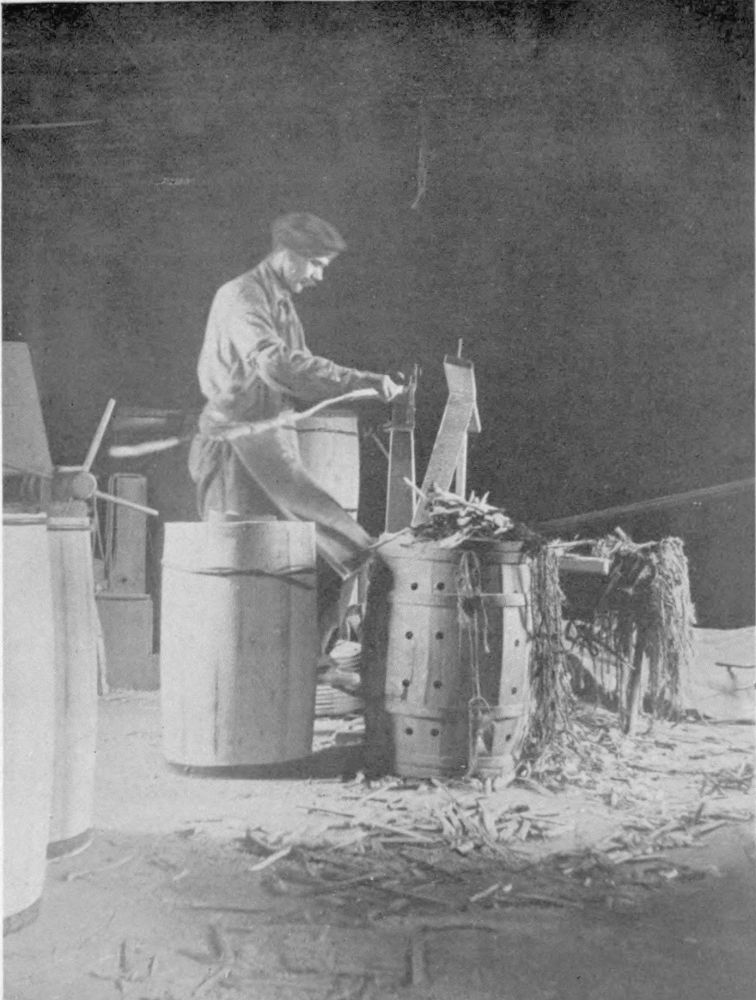 The smell of the scorching barrel by this time fills the cooperage with its own peculiar perfume anew, like puffs of incense, from a censor replenished. Now the cooper turns again to his work, visitors out of mind. He lifts the barrel over the head of the stove, selects an adze and a split birch-wand. In a twinkling, a curve is swept around the barrel and with the eye alone, expert measurement is taken of the long wood-ribbon. Slish! The adze has cut! Attention is now drawn to a handmade arrangement into which the cooper is slipping the ribbon. His foot comes automatically in contact with a treadle and the withe is turned out, curved permanently. In a twinkling, the adze cuts the little jib-slit—two of them, one in each end—into which the hoop, now wound around the barrel has its ends locked forever. Set like a garland about the barrel-head the hoop is driven into place, tapped round and round and round. The inner edges of the staves are now bevelled off; the groove cut and the head hammered into place. Then on goes the last hoop. And, presto! The barrel is done and thrown over to one side among two or three score of its fellows. The cooper puts some of the shavings into the stove and starts at once, all over again on another barrel. You can see that in his mind’s eye he carries a vision of score upon score of waiting orchards, waiting for his barrels, the barrel that he feels it a moral obligation to supply.