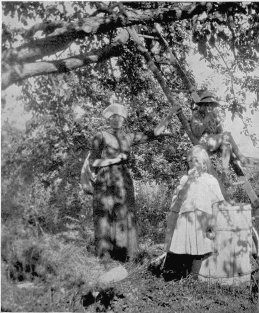 It is a family party, even the baby is here holding an apple in hand. The family cat rubs its nose on every pair of legs before strolling to hunt a field mouse. A mother wagers with her lad,{14} willowy as an apple branch, that she can beat him filling a barrel. Tall ladders, home-made, loll against the topmost branches of Bellefleur and Baldwin. The father of the family cuts out the full barrels for a trip to the Station or Packing house to which he sells. The general conversation may centre around apples or it may wander off, as it is likely to, into an epic of hunting, shooting and bringing home the moose John got yesterday. Or, it may take a turn and become a tale of adventure, telling how Jamie, coming into the orchard this morning, encountered two bears, berry-hunting, directly in the path.