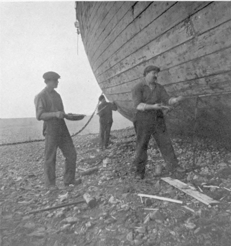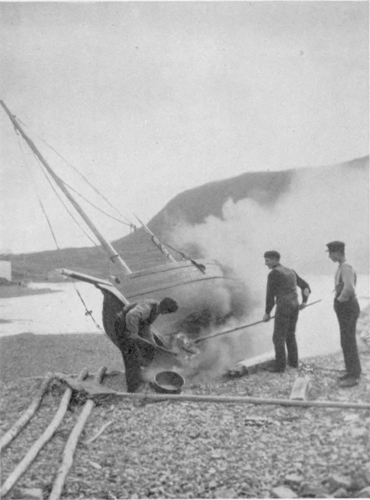 The old boat that calls for tar is certainly a personality. Coming nearer, and taking care to keep to windward, you stalk this group and watch. First there is the fiery cauldron, that is the Tar-pot, above its blaze of driftwood, with its own special attendant, looking like a Prince of Darkness, wielding the long-handled dipper; and at a little distance by the boat two other figures with long brushes, calling for ladles of tar. Good and thick they lay it into the old seams and over the old plank, the smoke pouring upward like smoke of incense, offered on the altar of the great out-of-doors.{18}