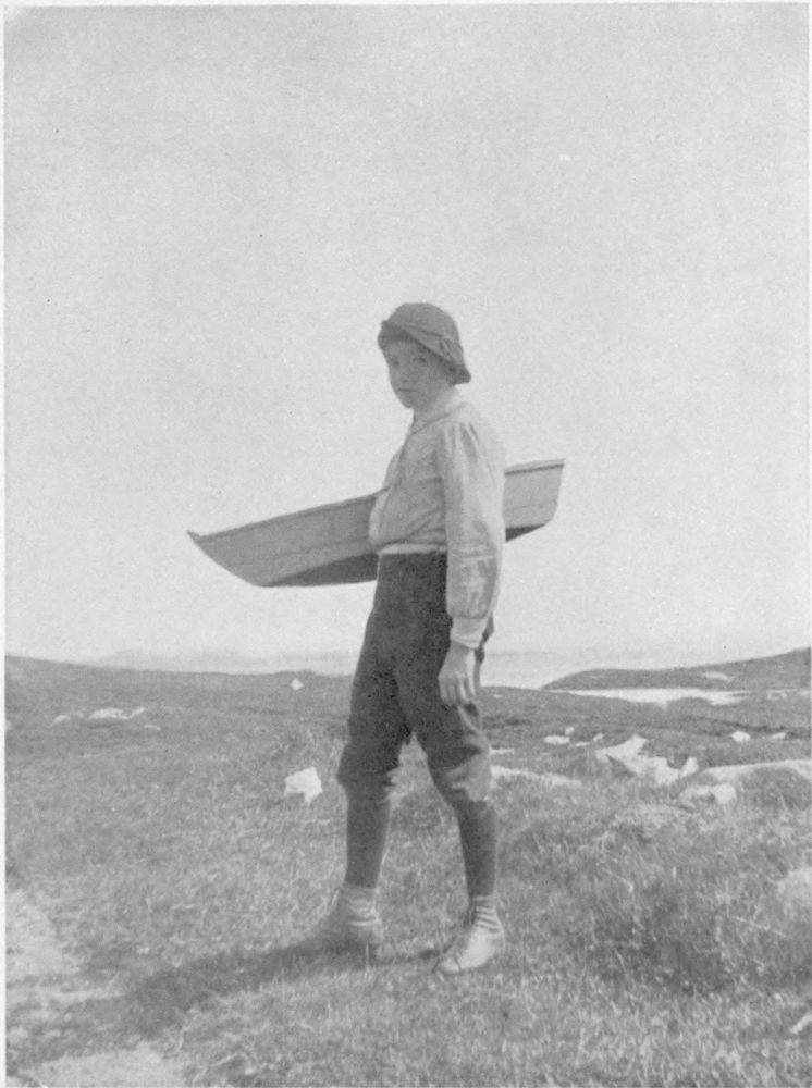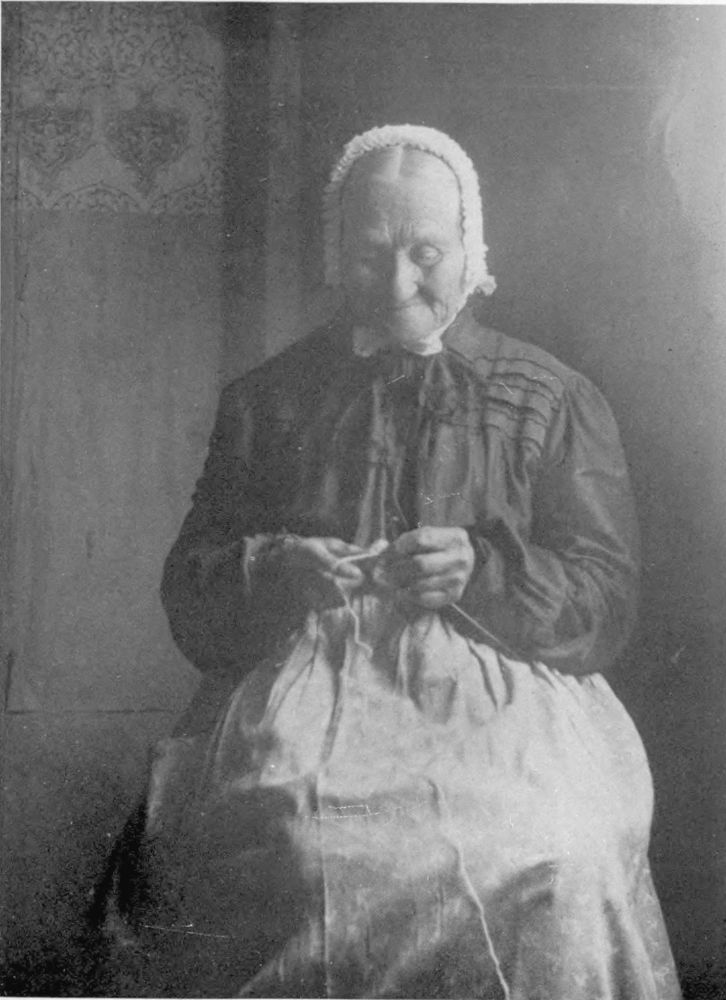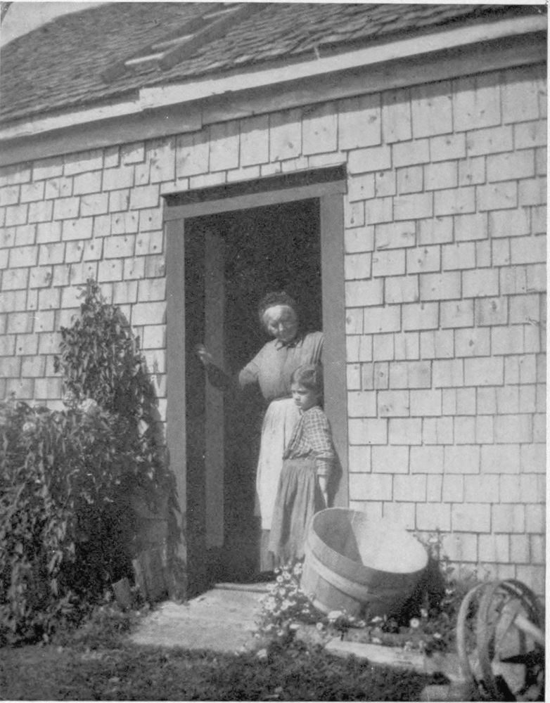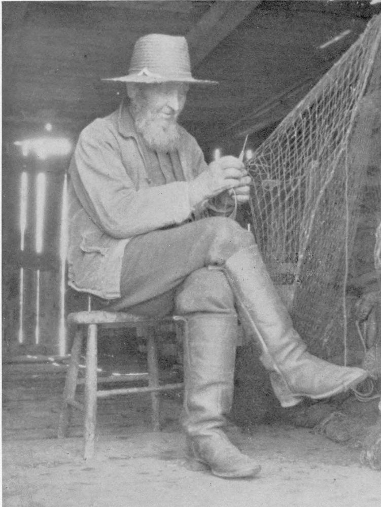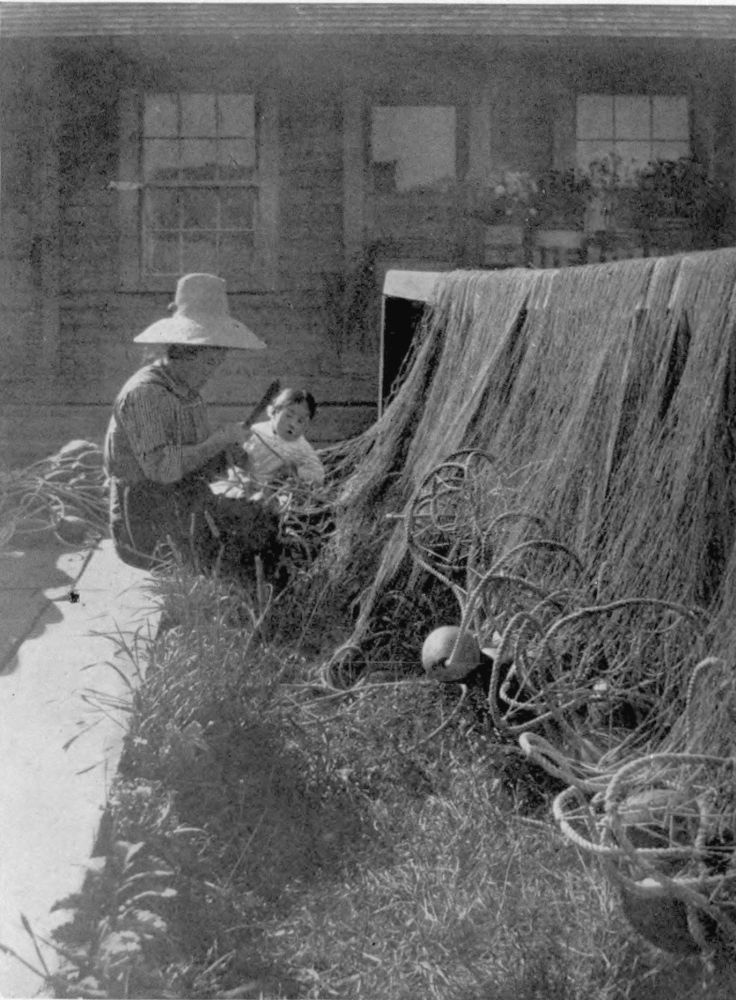 One summer, visiting with the Lighthouse-keeper’s family in their characterful little binnacle-home on the edge of the rocks at Peggy’s Cove, our last day for adventuring having arrived, and even as we waited for the coming of the mail-carrier’s cart by which we had engaged “outward passage”, we strolled down to the waterfront to say a last farewell to our “old-timers”. It was at that last moment, in what turned out to be the eleventh hour of his life, that we chanced upon a ninety-year-old grandfather in high boots and straw hat placidly catching up with his nonogenarian fingers the broken meshes of an old net. Mailcart or not, we must have this picture! Click! As it happened, mending this bit of net was his last task. For before the picture which we promised to send back to him could come into his hand, the Great Reaper had brought him to his last illness and he was soon awa’!{21}{20}