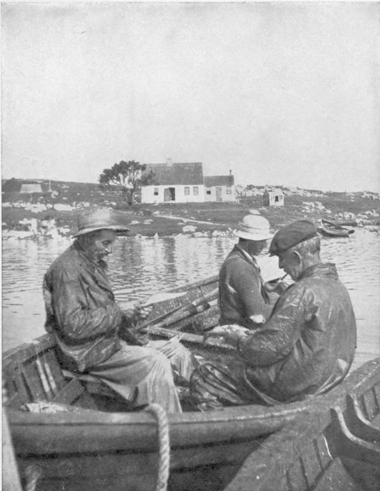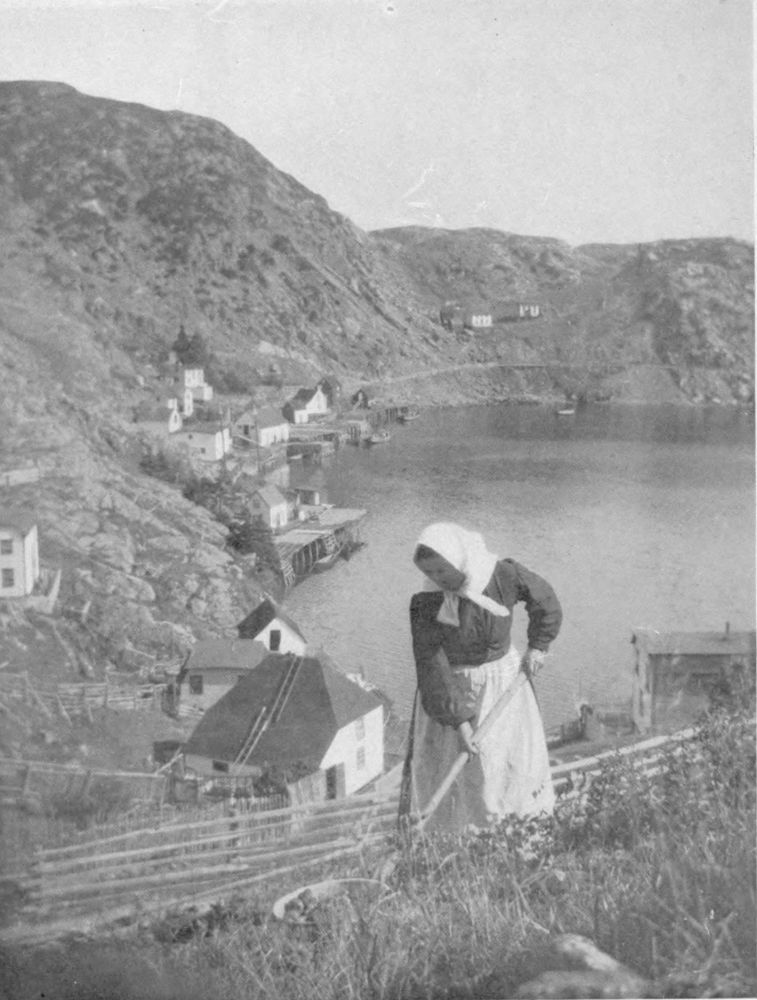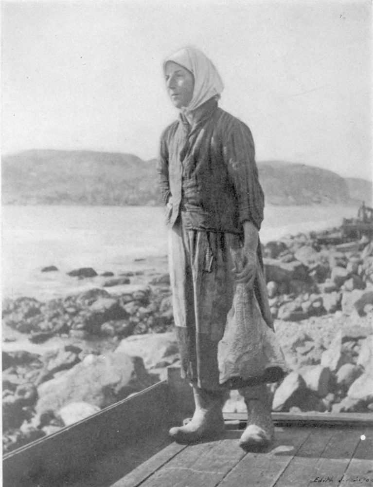 Catching the Cod seems to be the least part of the work when one beholds the amount of labour expended on the Shore-End. Early and late, during the season, the women stand to their task of drying the fish. When the weather is fine two weeks often slip away before a batch of cod is properly hardened and “dry”. Fish, destined for the long voyage to the West Indies and where Tropic heat is likely to cause a sweat in the “hold”, the Canadian and Newfoundland fishwives “cure” until it is hard as the proverbial brickbat. The amount of fish-lore contained in the heads of these women with ballooning skirts, is amazing. As judges of weather, they often put the “Weather-man” to shame. Sometimes the coming cloud is entirely unseen by the mere stroller when these women begin pell-mell to take in the fish. And when a fine evening says it is safe to leave the fish out all night, these careful souls may be seen turning over each fish, “oil-skins” up, in case