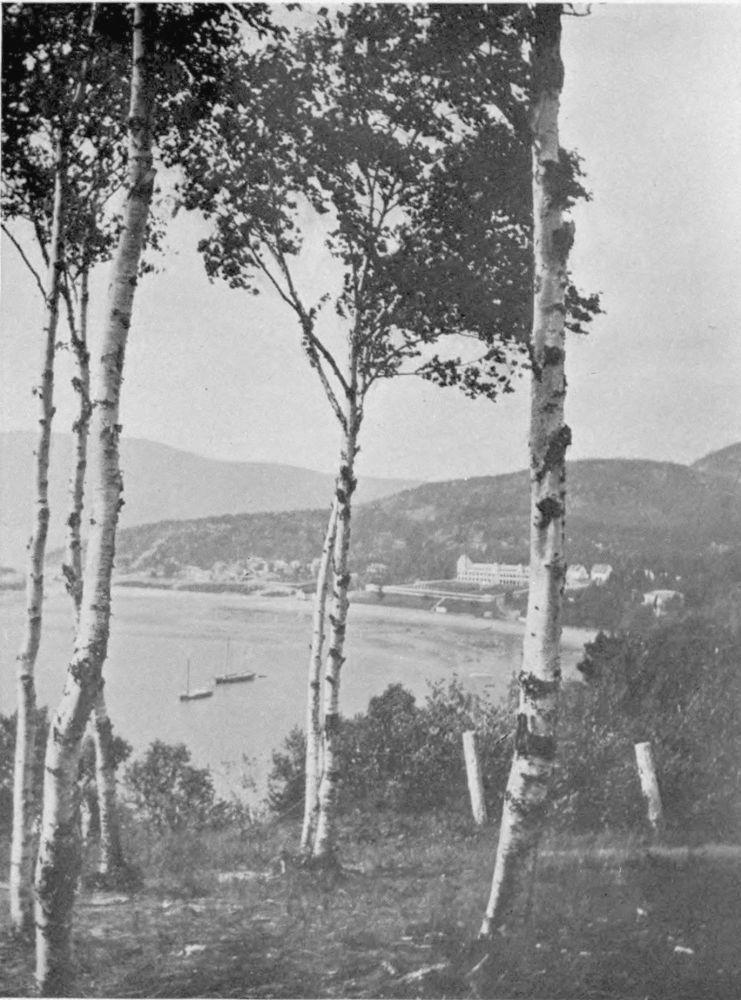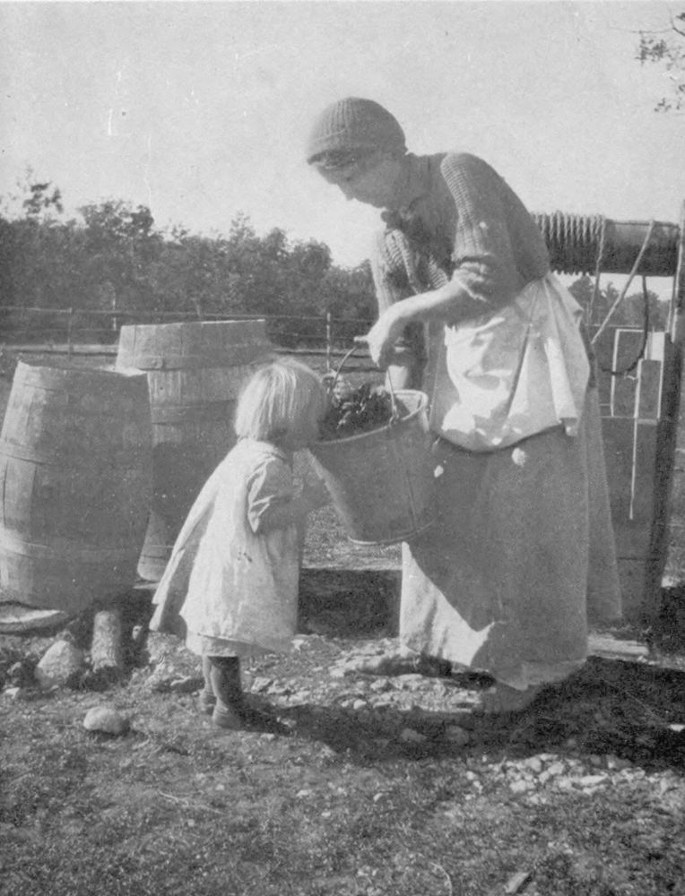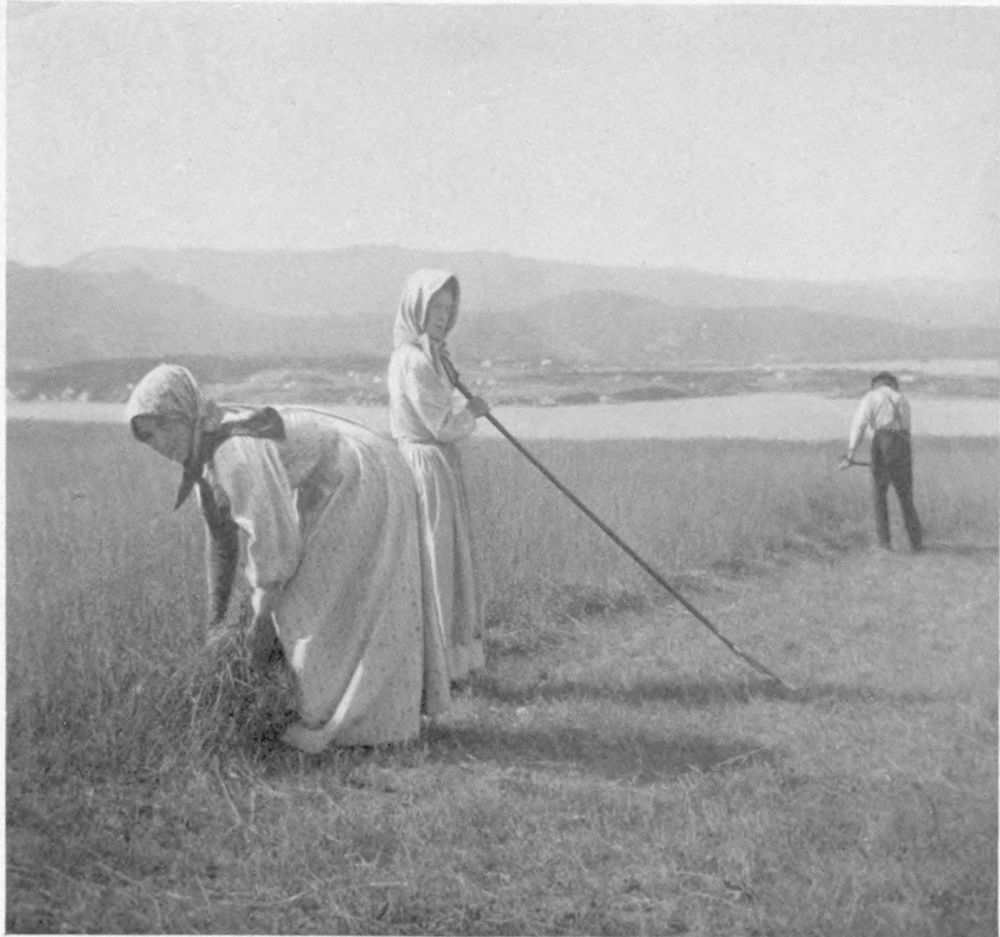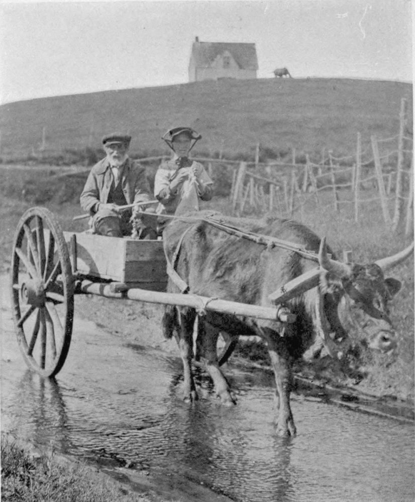In addition to her fishing industry and tale of ships, Nova Scotia enjoys a pastoral side no less rich in genre. Farms are here. In following the highways and little by-paths rambling among apple orchards and gardens, potato fields and hay meadows—paths etched in Spring by the pink flush of apple-blossoms, or in autumn by boughs curving to earth under weight of rosy Baldwins or creamy Bellefleurs—one follows everywhere hard on the heels of romance. It is her hand that beckons into every little cottage snugly tucked away in valley and glen; where every grandmother sitting carding, spinning, hooking rugs, knitting or reading her daily portion of Scripture, can keep you entertained with tales and the recounting of interesting happenings and not go outside the range of the half-dozen houses which have been her little world for more than half a century.