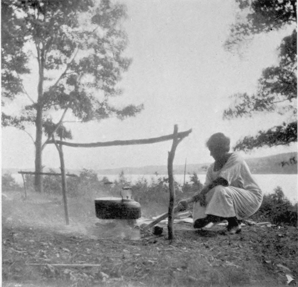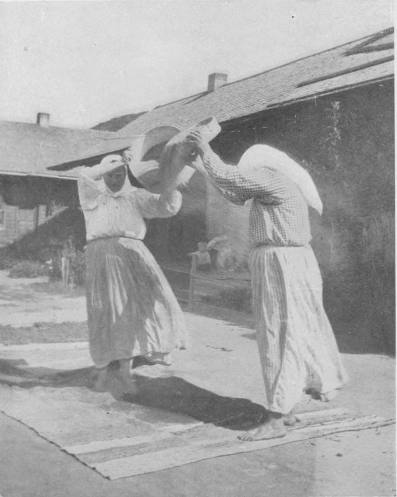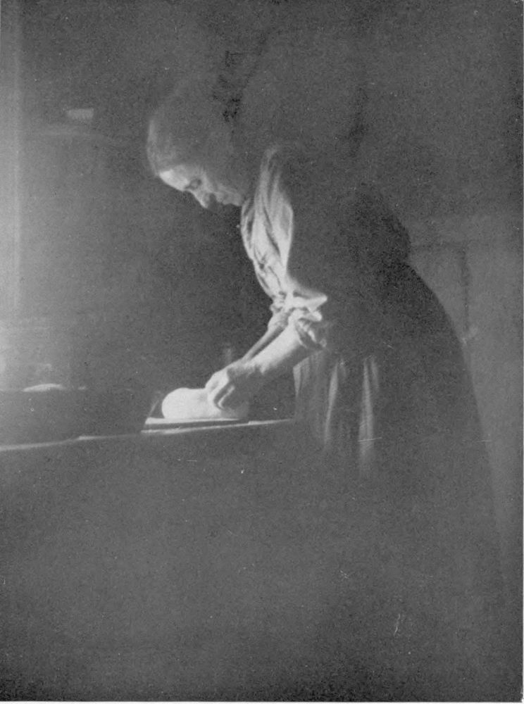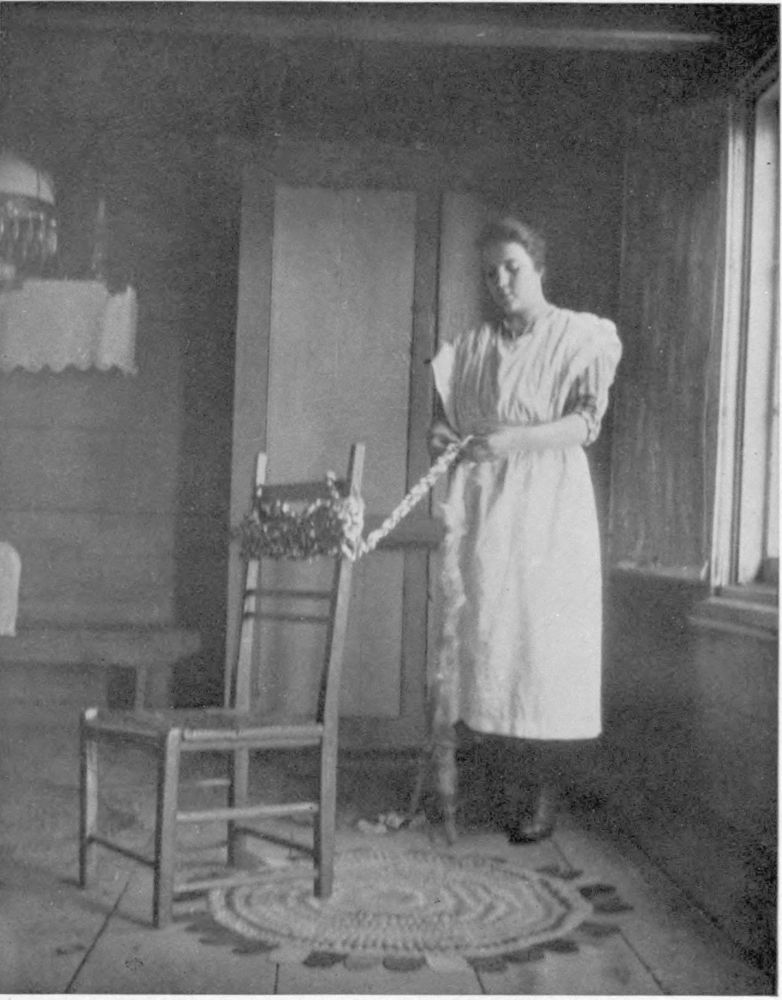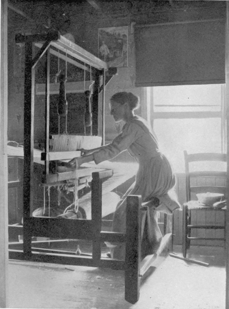 of a shower. These women turn easily to housekeeping duties, and often the out-of-door tasks accomplished, continue the web of romance with knitting, spinning and hooking rugs.