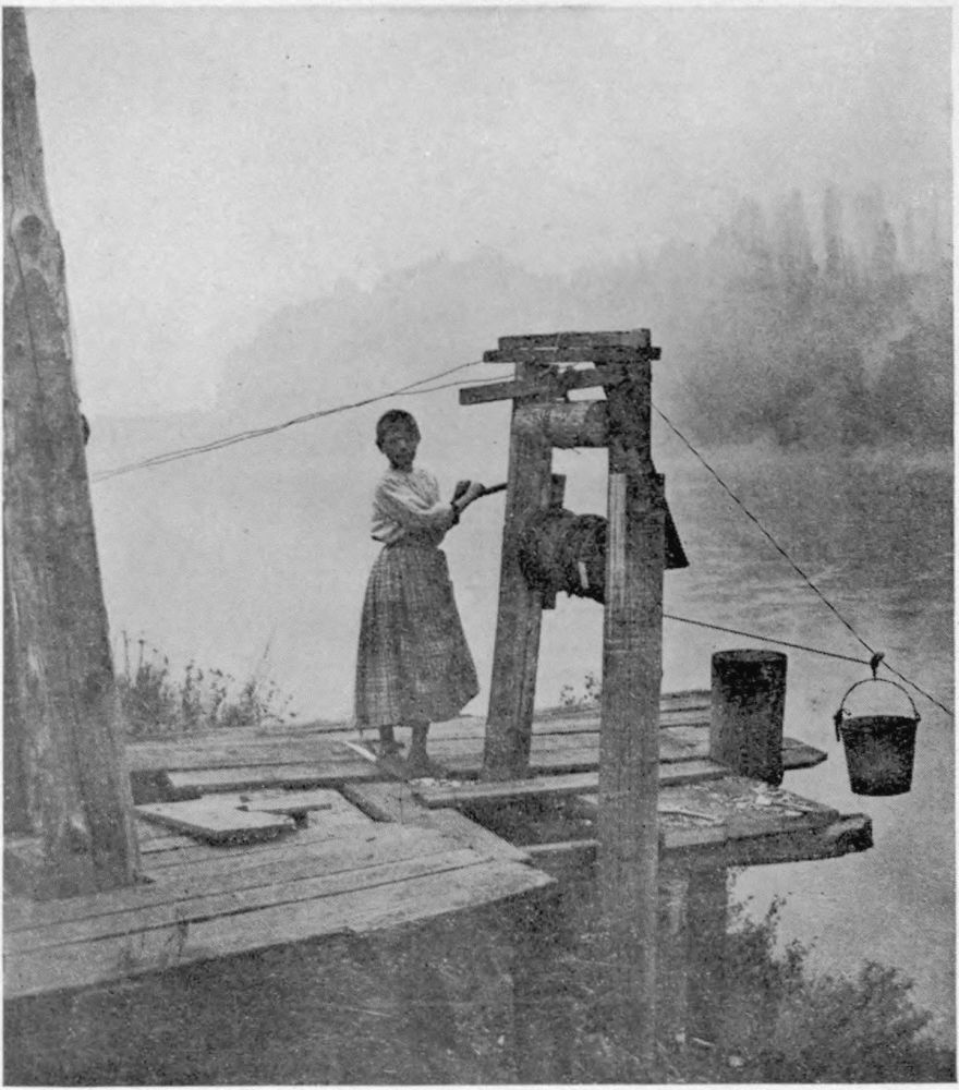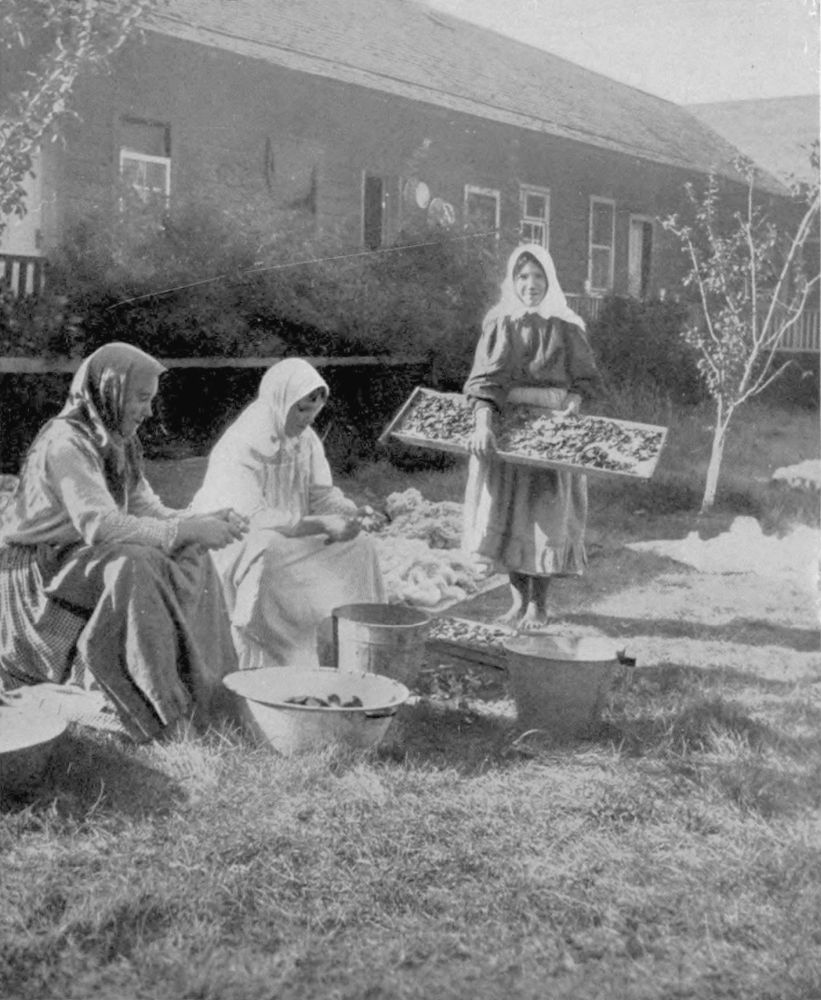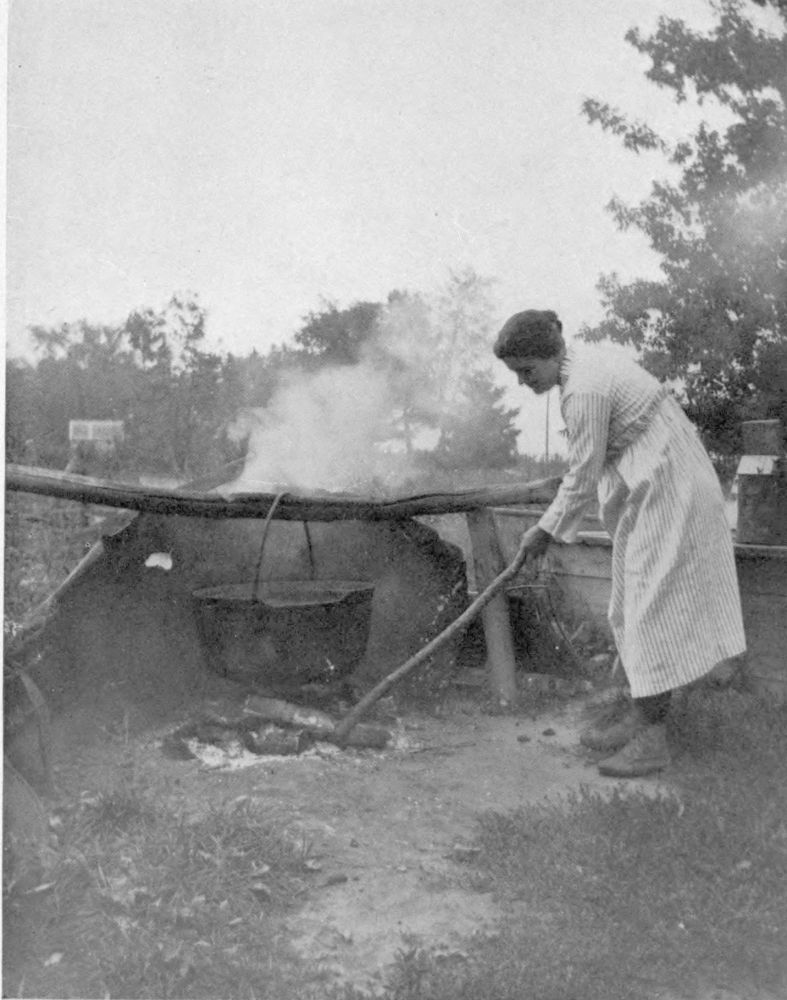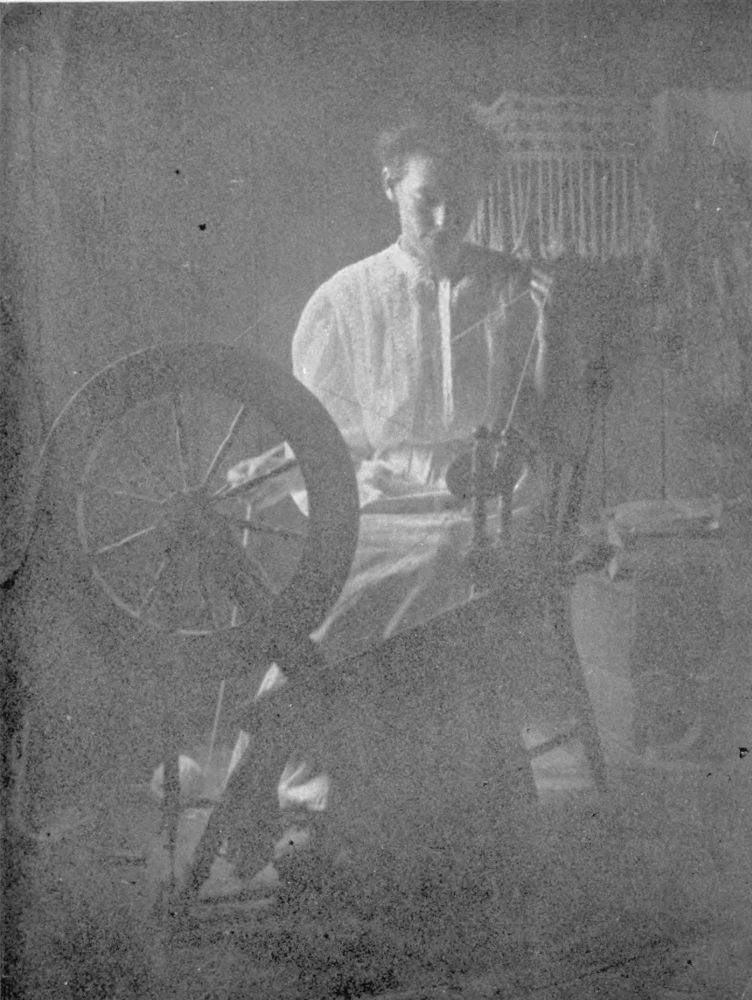 of a shower. These women turn easily to housekeeping duties, and often the out-of-door tasks accomplished, continue the web of romance with knitting, spinning and hooking rugs.
