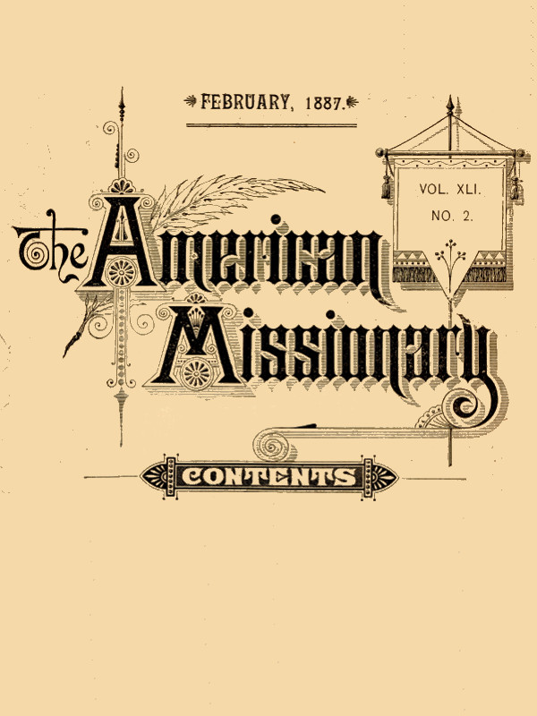 The Project Gutenberg EBook of The American Missionary -- Volume 41, No. 2, February, 1887, by Various This eBook is for the use of anyone anywhere in the United States and most other parts of the world at no cost and with almost no restrictions whatsoever. You may copy it, give it away or re-use it under the terms of the Project Gutenberg License included with this eBook or online at www.gutenberg.org. If you are not located in the United States, you'll have to check the laws of the country where you are located before using this ebook. Title: The American Missionary -- Volume 41, No. 2, February, 1887 Author: Various Release Date: April 3, 2018 [EBook #56910] Language: English Character set encoding: UTF-8 *** START OF THIS PROJECT GUTENBERG EBOOK AMERICAN MISSIONARY, FEBRUARY 1887 *** Produced by Joshua Hutchinson, KarenD and the Online Distributed Proofreading Team at http://www.pgdp.net (This file was produced from images generously made available by Cornell University Digital Collections)