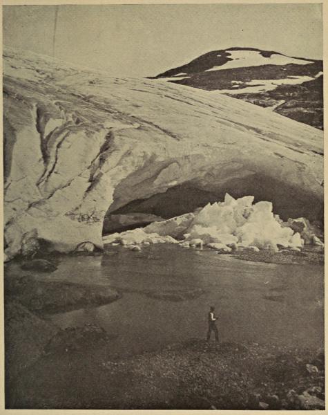 Sometimes the Hardanger’s gentle smile has savored of the nature of a mask, for in one of its foses it has kept a lurking danger. Far inland through the Eidfjord and the Simodal there is on a high plateau a glacier named the Rembesdal. From this a stream trickles into a mountain lake, then to plunge over a cliff into the Simodal. In former years, whenever the snow melted suddenly on the Rembesdal Glacier, the water thus formed would collect in a rocky upland valley choked off by the glacier itself from every exit. The water would gradually collect here until it was a small lake in itself, and still the glacier barred its way to freedom. Finally the strain would become too great, the barrier would give away, and the irresistible mass of ice, pushed on by the lake which it had formed, would plunge madly down into the lower lake, then over the cliff, and down into the peaceful, unsuspecting Simodal, where it would drown and destroy all that lay in its path. Finally human skill came to the aid of nature, and Norwegian engineers built under the glacier an iron tunnel through which the waters of the upper, artificial lake may drain down into the lower, natural lake.