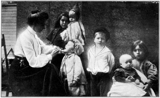 The matron of a Day Nursery examining a child’s throat. The two “Little Mothers” are typical.