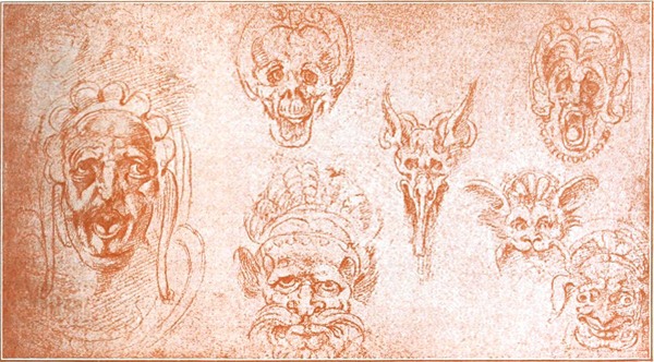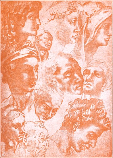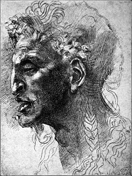 Nach der Vollendung des David galt Michelangelo unbestritten als der erste Bildhauer der Welt. Noch in demselben Jahre 1504 trat die Aufgabe an ihn heran, mit dem größten Maler der Zeit, mit Leonardo da Vinci, um die Palme zu ringen. — Leonardo hatte im Jahre 1482, damals ein dreißigjähriger, schon viel bewunderter Mann, seine florentinische Heimat verlassen: nach achtzehnjähriger Abwesenheit kehrte er zurück, mit dem höchsten Ruhme gekrönt. Die Vielseitigkeit seiner Unternehmungen ließ ihn auch jetzt immer nur mit Unterbrechungen in Florenz verweilen; im Anfang des Jahres 1504 aber glaubte Soderini ihn durch einen großen und ehrenvollen Staatsauftrag enger an die Stadt gefesselt zu haben. — Wie reif auch Michelangelos künstlerische Eigenart zu dieser Zeit entwickelt war, von diesem einen Manne, der so bezaubernd schön zeichnete und der so bestrickenden Liebreiz in Formen kleiden konnte, erfuhr auch er noch einen Einfluß. Es ist oft bemerkt worden und auch unverkennbar, daß Michelangelo in einer ganzen Anzahl sorgfältig ausgeführter Rötel- und Kreidezeichnungen sich bestrebt hat, mit der Art und Weise Leonardos zu wetteifern. Es sind dies namentlich Charakterköpfe mannigfaltiger Art, bald von weicher, jugendlicher Anmut, bald von einer an die Karikatur streifenden Schärfe der Kennzeichnung, feine Studien über die Form und den Ausdruck des menschlichen Gesichts; auch phantastische Bildungen gehören hierhin, wie die seltsamen Auftürmungen des Kopfputzes über schönen Frauenprofilen oder verschiedenartige fratzenhafte Masken (Abb. 16, 17, 18). Als Nachahmungen darf man indessen derartige an Leonardo erinnernde Zeichnungen Michelangelos keineswegs ansehen; seine[S. 18] Eigenart hat der junge Meister überall bewahrt. Dem Gesichtsausdruck hat Michelangelo auch unabhängig von Leonardo das eingehendste Studium gewidmet. Von der Meisterschaft, mit welcher er die unwillkürliche und flüchtige Thätigkeit der Gesichtsmuskeln wiederzugeben vermochte, gibt eine in der Uffiziensammlung zu Florenz befindliche Kreidezeichnung das berühmteste Beispiel, welche unter dem Namen „der Schrecken,“ „die Raserei“ oder „die verdammte Seele“ bekannt ist: ein Kopf mit gesträubten und in heftiger Bewegung flatternden Haaren, dessen Augen sich starr auf irgend etwas Fürchterliches heften und dessen Mund sich zu einem Schrei des rasendsten Entsetzens öffnet (Abb. 19). — Leonardo da Vinci begann in den ersten Monaten des Jahres 1504 mit der Ausführung des Auftrags, den Soderini ihm im Namen der Republik erteilt hatte. Es handelte sich darum, den auf Savonarolas Veranlassung erbauten großen Ratssaal des Regierungspalastes mit Freskogemälden zu schmücken. Der Gegenstand, welchen Leonardo auf einer umfangreichen Wandfläche zu schildern übernahm, war der Sieg der Florentiner über mailändische Truppen bei Anghiari (im Jahre 1440). Die Ausführung des Gegenstücks zu dieser Darstellung dachte Soderini dem Michelangelo zu; er hoffte, daß die beiden großen Künstler im Wetteifer miteinander ihre Kräfte auf das höchste anspannen würden. Gegen den Herbst des Jahres 1504 bekam Michelangelo den Auftrag, für die zweite Hauptwand des Ratssaales ein Schlachtenbild aus der früheren florentinischen Geschichte zu entwerfen. Er wählte einen Gegenstand aus den Kämpfen um Pisa im XIV. Jahrhundert, deren Endergebnis die Unterwerfung dieser Stadt unter die Botmäßigkeit von Florenz war, und zwar einen Gegenstand, der ihm Gelegenheit gab, viele unbekleidete Gestalten in mannigfaltiger und lebhafter Thätigkeit darzustellen: die Abwehr eines Überfalles, den der Feind an einem heißen Tage unternahm, während die florentinischen Reiter im Arno badeten. Michelangelo mag mit einem ungestümen Verlangen, Leonardo zu übertreffen, an die Arbeit gegangen sein. Denn er war ein leidenschaftlicher Nebenbuhler;[S. 19] er ließ sich sogar zu ganz ungerechtfertigter Gehässigkeit gegen den älteren Meister hinreißen, wenn ein ungenannter Zeitgenosse Wahres berichtet, der in einer Schrift über Leonardo da Vinci die aufbrausenden Scheltworte anzuführen weiß, welche Michelangelo diesem entgegenschleuderte bei einer Gelegenheit, wo beide Künstler von einer mit der Auslegung Dantes beschäftigten Gesellschaft ersucht wurden, eine dunkle Stelle der Göttlichen Komödie zu erklären. — Vor dem Frühjahr 1505 hatte er den Karton zu dem Bilde aus dem Pisanerkrieg, den er abgeschlossen von aller Welt in einem ihm zu diesem Zwecke eingeräumten Saal im Spital der Färberzunft anfertigte, vollendet. Den Kunstverständigen der Zeit erschien diese Zeichnung als die staunenswürdigste Schöpfung Michelangelos; keines seiner späteren gewaltigen Werke erregte — wenn Vasari recht hat — solches Aufsehen in Künstlerkreisen; zu dem im Ratssaal auf[S. 20]gestellten Karton, der das Emporklettern der Badenden aus dem Fluß, das hastige Ankleiden und Waffnen, das Stürmen zum Kampf und den Beginn des Reitergefechts schilderte, wallfahrteten die Maler von nah und fern, um daraus zu lernen. — Zur Ausführung in Farben gelangte Michelangelos Schlachtenbild ebensowenig wie dasjenige Leonardos. Leonardo hatte wenigstens einen Anfang gemacht, indem er die berühmte Gruppe der vier Reiter, welche um eine Fahne kämpfen, auf die Wand malte; Michelangelo kam nicht einmal so weit; er wurde von Papst Julius II nach Rom berufen und blieb von da ab fast ganz ausschließlich im Dienst der Päpste thätig. — Der Karton der Pisanerschlacht ist vollständig verloren gegangen; er wurde in Stücke zerrissen, sei es nun, daß neidische Bosheit ihm dieses Schicksal bereitete, wie Vasari an einer Stelle ausdrücklich sagt, sei es, daß er von bewundernden Kunstjüngern und rücksichtslosen Sammlern zum Opfer ihrer Begeisterung gemacht wurde, wie man aus einer anderen Stelle Vasaris herauslesen könnte. Die Stücke, von denen im Jahre 1575 noch einige in Mantua vorhanden waren, sind spurlos verschwunden. Wie unsere Kenn
