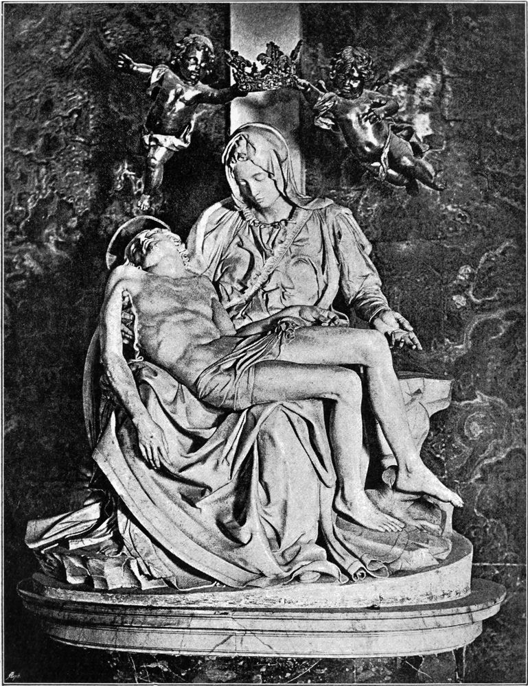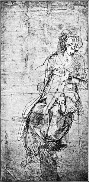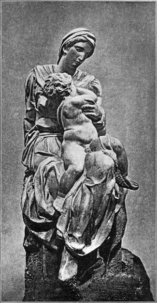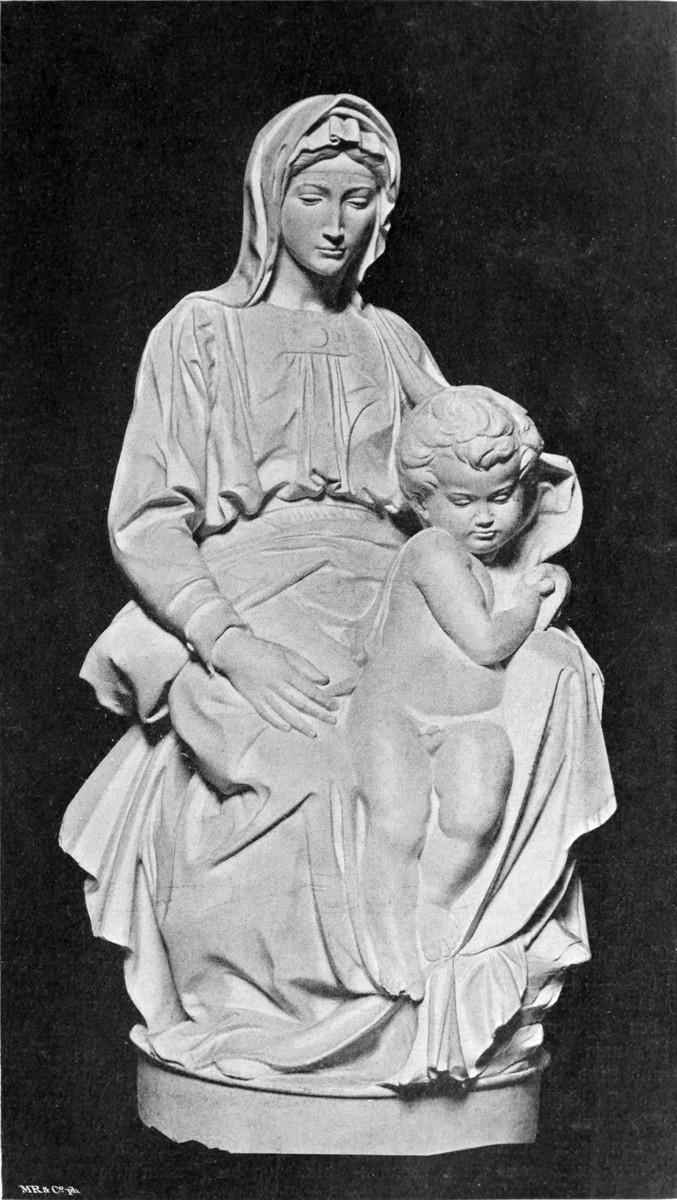 Im Frühjahr 1503 bestellten die Vorsteher der Wollweberzunft und die Bauverwaltung des Doms bei Michelangelo die Figuren der zwölf Apostel für den Dom; sie waren so verständig, dem Meister Zeit zu lassen: im Laufe von zwölf Jahren sollte er jährlich eine Figur liefern. Aber es scheint, daß Michelangelo an solchen in Gewänder gehüllten, ruhig dastehenden Einzelfiguren keinen Geschmack fand. Er kam mit diesen Aposteln noch lange nicht so weit, wie mit den Heiligenfiguren von Siena. Es ist nichts von denselben zustande gekommen, als die allererste Anlage eines heiligen Matthäus. Diese eben angelegte Figur aber, die sich jetzt in der Akademie zu Florenz befindet, ist im höchsten Maße bemerkenswert, weil sie zeigt, wie Michelangelo beim Schaffen seiner Marmorbilder zu Werke ging. An der einen Seite des Marmorblocks werden die Formen der Figur in ganz leichter Andeutung sichtbar, in schwachem Relief, fast wie eine Zeichnung. So skizzierte der Meister sich das ganze Bild, wie es werden sollte, an der Oberfläche des Blocks, und indem er in dem Maße, wie die Formen weiter zurücktreten sollten, tiefer in den Marmor hineinarbeitete, schälte er schließlich die Figur heraus. Reliefbilder hat Michelangelo nur wenige angefertigt. Abgesehen von jenen Arbeiten seiner Knabenjahre weiß man nur von zweien. Diese fallen beide in die Zeit, in welcher der große David im Entstehen oder eben vollendet war. Beide sind Madonnenbilder in Rundformat; beide wurden für Florentiner Kunstliebhaber angefertigt und sind nicht bis zum letzten Grade der Vollendung in der Ausführung gekommen. Das eine derselben befindet sich jetzt in der Akademie zu London, das andere im Nationalmuseum zu Florenz. Über dem zu Florenz befindlichen Reliefbilde, welches Maria auf einem niedrigen Steine sitzend und den Beschauer anblickend, das Christuskind an der Mutter Knie gelehnt und wie in tiefe Gedanken versunken darstellt, liegt ein eigentümlicher Reiz, eine Mischung von schwerem Ernst mit hoher Lieblichkeit. Dieselbe Empfindung lebt in der wunderbar schönen lebensgroßen Gruppe von Maria mit dem Kinde, welche Michelangelo auf die Bestellung von flandrischen Kaufleuten, Johann und Alexander Mouscron, anfertigte; dieses Madonnenbild wurde wahrscheinlich zu Carrara im Jahre 1505 ausgeführt; es befindet sich noch an seinem ursprünglichen Bestimmungsort, auf einem Seitenaltar in der Liebfrauenkirche zu Brügge (Abb. 12). Michelangelo hat bei der Madonna von Brügge und bei dem Florentiner[S. 16] Relief die herkömmliche Weise, welche Jesus als ganz kleines Kind auf dem Schoße Marias sitzend darzustellen pflegte, verlassen, indem er den Knaben in einem Alter bildete, welches ihm schon auf seinen Füßchen zu stehen gestattet; so konnte er das Christuskind sich mit Freiheit bewegen lassen, und er hat den Späteren das Beispiel gegeben, die innig geschlossene Gruppe von Mutter und Kind in unendlicher Mannigfaltigkeit der Beziehungen zu gestalten.