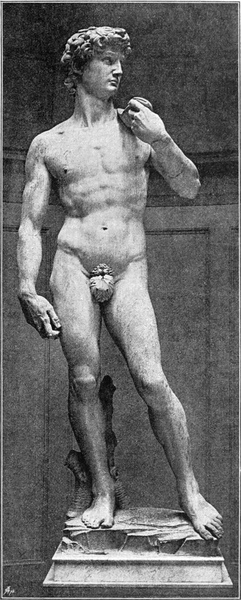 Kurze Zeit nach der Unterzeichnung des Vertrags mit Franz Piccolomini, am 16. August 1501, wurde Michelangelo von den Vorstehern des Dombaus zu Florenz, den Zunftmeistern der Wollenweber, mit der Ausführung eines Kolossalstandbildes betraut. Der Bildhauer Agostino di Duccio hatte im Jahre 1463 den Auftrag bekommen, einen David von neun Ellen Höhe anzufertigen, welcher oben auf dem Dom aufgestellt werden sollte. Aber die Dombauverwaltung war nicht mit seiner Arbeit zufrieden und löste 1466 den mit ihm geschlossenen Vertrag. Seitdem lag der angehauene Riesenblock nutzlos im Hof der Dombauhütte, bis man im Jahre 1501 sich entschloß, ihn aufrichten und bearbeiten zu lassen, wenn auch nicht mehr für den ursprünglichen Zweck. So trat an Michelangelo eine Aufgabe heran, welche neben der Schwierigkeit, die an und für sich in der Gestaltung einer Figur von so großem Maßstabe lag, die größere Schwierigkeit enthielt, daß der Künstler durch die Gestalt, welche der erste Bearbeiter des Blockes diesem bereits gegeben hatte, an bestimmte Umrisse gebunden und so in der Freiheit des Schaffens gehemmt war. Michelangelo behielt den Gedanken bei, dem Riesenbild die Gestalt eines David zu geben. Aber er dachte sich David nicht als den Propheten und nicht als den König, sondern als den Helden, der, noch bevor er die Schwelle des Jünglingsalters erreicht hat, den Feind seines Volkes niederstreckt; er dachte sich den Heldenknaben in dem Augenblick, wie er mit todesmutiger Entschlossenheit den Feind ins Auge faßt, wie er mit dem rechten Fuß sich feststellt für den Wurf, während er mit der linken Hand die Schleuder von der Schulter nimmt und in der rechten den Stein bereit hält. Daß die Kolossalgestalt die Schönheit ihrer Formen gänzlich unverhüllt zeigen müsse, verstand sich für Michelangelo, der[S. 13] die antiken Kolosse auf dem Monte Cavallo in Rom gesehen hatte, ganz von selbst, und es wurde auch von den Zeitgenossen als selbstverständlich hingenommen. Er ging mit Feuereifer an das Werk. Nachdem er eine kleine Skizze in Wachs modelliert hatte, welche noch in der Sammlung des Hauses Buonarroti aufbewahrt wird, bestieg er am 13. September 1501 das Gerüst, mit welchem die Dombauverwaltung den Marmorblock hatte umgeben lassen, und begann die gewaltige Arbeit. Anfang 1504 war der Riese — il gigante, so wurde das Standbild meistens genannt, da das Gegenständliche, der David, als Nebensache galt — vollendet (Abb. 11). Eine vom Dombauvorstand einberufene Versammlung von dreißig Männern, unter denen sich alle berühmten Künstler der Stadt befanden, beriet über den Platz der Aufstellung. Leonardo da Vinci und mit ihm mehrere andere schlugen die Loggia dei Lanzi als geeigneten Ort vor, da hier das Marmorwerk vor den Einflüssen der Witterung geschützt bliebe. Die Mehrheit aber beschloß die Aufstellung vor dem Palast der Signoria. Das Bild des David sollte die Väter der Stadt durch seinen täglichen Anblick mahnen, daß sie dieselbe allezeit mit Entschlossenheit zu verteidigen und mit Gerechtigkeit zu regieren hätten. Mit Hilfe von Vorrichtungen, welche die Zeitgenossen umständlich beschrieben haben, wurde das 180 Centner schwere Standbild vom Dombauhof nach der Piazza della Signoria gebracht; die Überführung dauerte vier Tage. Die Enthüllung war ein Ereignis für die Stadt, das in den Jahrbüchern sorgfältig verzeichnet wurde. Keine bildnerische Schöpfung Michelangelos hat bei den Zeitgenossen so ungeteilten Beifall gefunden, wie der „Gigante“; alle Bildwerke des Altertums glaubte man in ihm übertroffen. — Im Jahre 1527 erlitt der Marmorriese eine Beschädigung: bei einem Aufruhr traf ein unter die Belagerer des Palastes geschleuderter Mauerstein seinen rechten Arm, der herabfiel und in drei Stücke zerbrach; erst 1543 wurden die aufgehobenen Stücke[S. 14] wieder angesetzt. Im Laufe der Jahrhunderte stellte es sich heraus, daß diejenigen nicht unrecht gehabt hatten, welche rieten, das Standbild unter Dach aufzustellen; die Einwirkung der Witterung machte sich, wenn auch nur wenig, bemerkbar. Darum wurde dasselbe im Jahre 1873 von seinem Platze weggenommen und in die Akademie gebracht. Eine Kopie in Erzguß ist auf der schönen Piazza Michelangelo in den neuen Anlagen im Süden der Stadt aufgestellt worden.