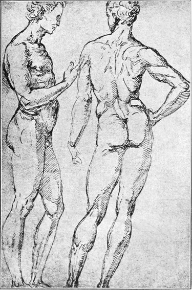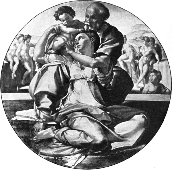 Noch sprechender zeigt sich die Unabhängigkeit von jeder überlieferten Darstellungsweise in einem gemalten Madonnenbilde, welches Michelangelo in eben jener Zeit, um das Jahr 1503, geschaffen hat. Es ist dies die berühmte heilige Familie, welche in der Tribuna der Uffiziengalerie zu Florenz einen Ehrenplatz einnimmt. Maria sitzt auf dem Boden und reicht mit einer anmutigen Wendung des Oberkörpers und des Kopfes das Jesuskind über ihre Schulter dem Pflegevater Joseph, der sich hinter ihr auf ein Knie niedergelassen hat (Abb. 13). Hinsichtlich der Farbe darf man keine Ansprüche an das Bild machen; denn diese ist dem Künstler augenscheinlich Nebensache gewesen, die Gruppe hätte ebenso gut in Marmor wie in Malerei ausgeführt werden können. Aber in der Zeichnung und Rundung der Formen ist es herrlich und in der Empfindung so groß wie liebenswürdig. Höchst befremdlich für den modernen Beschauer ist die Belebung des entfernten[S. 17] Hintergrundes durch nackte Jünglingsgestalten, die zu dem Gegenstand der Darstellung in gar keiner Beziehung stehen. Diese Gestalten hat Michelangelo nach Vasaris Worten da angebracht, „um noch besser zu zeigen, wie sehr groß seine Kunst sei.“ Das ist so recht im Sinne der Renaissance. Genau mit dem nämlichen Gefühl und aus dem nämlichen Grunde, wie die älteren niederländischen und deutschen Maler ihre Werke mit liebevoll ausgeführten Blumen und Kräutern und Vögelein geschmückt hatten, aus reiner Lust an dem neugewonnenen Können, das der Vorzeit verborgen gewesen war, so schmückten jetzt die italienischen Maler ihre Bilder mit nackten Figuren, um ihre Kenntnis von der Schönheit der Menschengestalt der Welt freudig zu offenbaren. Und wenn irgend einer, so durfte Michelangelo sich solcher Kenntnis rühmen; wenn gar keine ausgeführten Werke von ihm vorhanden wären, seine Zeichnungen — flüchtige Skizzen und durchgebildete Studien — würden es beweisen (Abb. 14 und 15). — Der erste Besitzer des Bildes der heiligen Familie war der Kunstliebhaber Angelo Doni in Florenz, der es von dem ihm befreundeten Künstler um hohen Preis erwarb.
