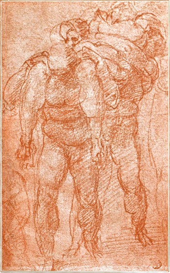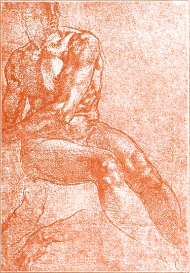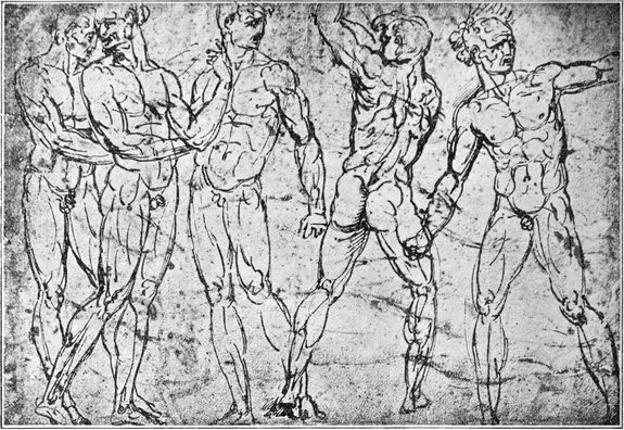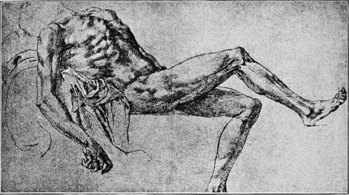 Dem sorgenfreien und anregenden Leben an dem glanzvollen Mediceerhofe machte der Tod Lorenzos des Herrlichen (am 8. April 1492) ein Ende. Michelangelo kehrte in das Haus seines Vaters zurück. Er kaufte einen unbenutzt liegenden Marmorblock und meißelte daraus einen Herkules. Dieses überlebensgroße Standbild kam im Palazzo Strozzi zur Aufstellung; 1529 wurde es verkauft und von seinem neuen Besitzer an König Franz I von Frankreich geschickt; im XVII. Jahrhundert stand es in einem Garten von Fontainebleau; dieser Garten wurde 1713 zerstört, um für neue Anlagen Platz zu schaffen, und Michelangelos bewunderter Herkules ist seitdem verschwunden. Verschwunden ist auch ein kleines Bildwerk, welches Michelangelo im Jahre 1494 ausführte: ein hölzernes Kruzifix, das auf dem Hochaltar der Kirche S. Spirito zu Florenz aufgestellt wurde. Der Prior von S. Spirito bewies dem jungen Künstler seine Dankbarkeit, indem er ihm im Kloster mehrere Zimmer zur Verfügung stellte, wo derselbe ungestört seinem Wissensdrang Genüge thun und durch das Zergliedern von Leichen sich eine eingehende Kenntnis vom Bau des menschlichen Körpers verschaffen konnte. Michelangelo betrieb das Studium der Anatomie mit großer Gründlichkeit; dasselbe ersetzte ihm beinahe gänzlich das Studium nach dem lebenden Modell. Unter den Zeichnungen, welche sich von seiner Hand[S. 5] erhalten haben, finden sich mehrfach anatomische Skizzen (Abb. 6). Sogenannte Aktstudien nach dem Leben kommen verhältnismäßig selten vor; sie sind aber wundervoll ausgeführt und bekunden auch ihrerseits das gediegenste anatomische Wissen (Abb. 3). Die größte Mehrzahl der Studienblätter Michelangelos — gleichviel ob sie seiner Jugendzeit oder seinem Alter angehören — lassen erkennen, daß der Meister aus dem Gedächtnis, auf Grund seiner vollkommenen Kenntnis der Knochen und Muskeln, sich über die gerade in Frage kommende Ansicht eines menschlichen Körpers oder Körperteils Rechenschaft zu geben gesucht hat; die Haut erscheint dabei sozusagen nur wie ein dünner Überzug über den formbestimmenden Teilen (Abb. 4).