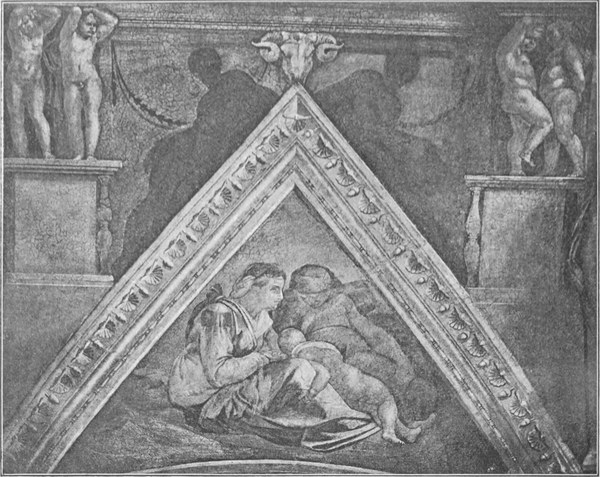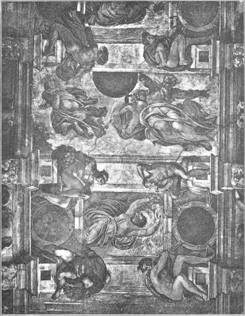 Das Feld, welches sich Michelangelo zum Bemalen darbot, als er am 10. Mai 1508 sich entschloß, den ersten Strich für diese Arbeit zu thun, umfaßte außer der zusammenhängenden Fläche der Decke die dreieckigen Felder der Stichkappen[S. 28] und die rundbogig begrenzten Wandstücke (Lünetten), welche unter den Kappen die Fensterbogen einrahmen. Die Bemalung der Wände bis zur Höhe der Gewölbansätze war schon unter Sixtus IV begonnen worden und seit geraumer Zeit vollendet. Verschiedene florentinische Meister hatten hier das Leben Christi und das Leben Moses’ geschildert, nach der im Mittelalter beliebten Weise der Gegenüberstellung von einander entsprechenden Begebenheiten des alten und des neuen Testaments. Für die Deckenmalerei hatte Julius II anfänglich keineswegs einen sehr reichen Inhalt in Aussicht genommen. Michelangelo hat darüber folgendes aufgeschrieben: „Der erste Entwurf des genannten Werks waren zwölf Apostel in den Zwickeln und das übrige in gewisser Einteilung angefüllt mit Zierwerk nach gebräuchlicher Art; nachher, als ich das Werk begonnen hatte, schien mir, daß es ärmlich ausfallen würde, und ich sagte dem Papst, daß, wenn ich die Apostel allein dahin machte, meines Erachtens die Sache ärmlich ausfallen würde; er fragte mich, warum; ich antwortete: weil sie selbst arm waren. Da gab er mir neuen Auftrag, ich solle machen, was ich wollte, und solle zufrieden sein, und solle alles bemalen bis an die unten befindlichen Geschichtsbilder heran.“ —