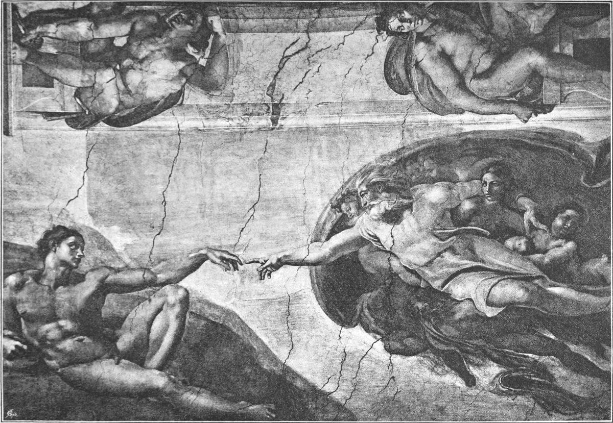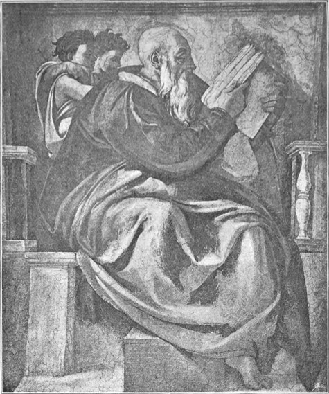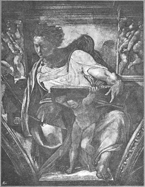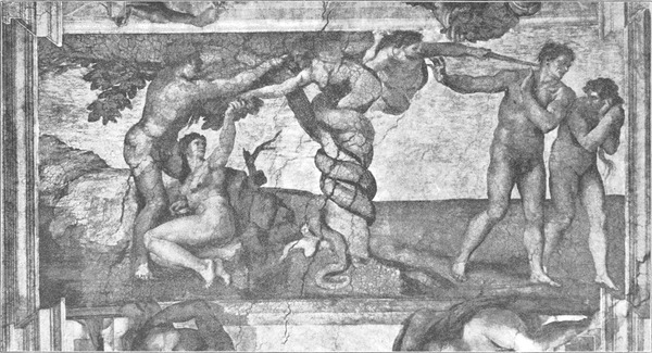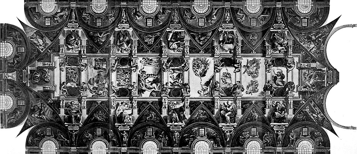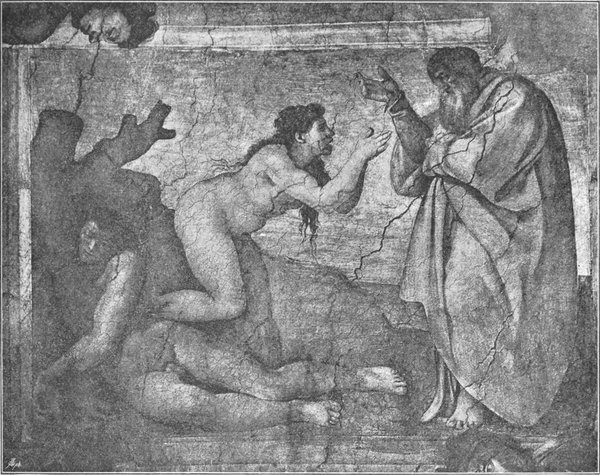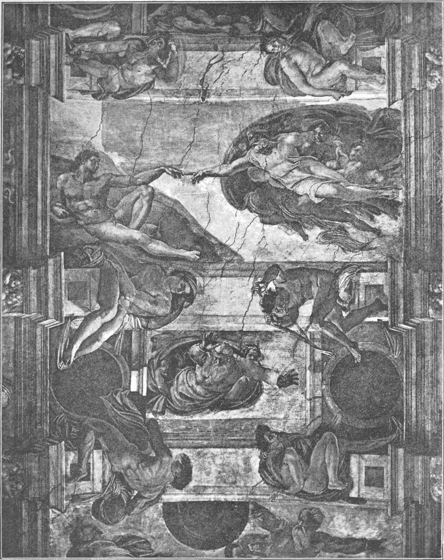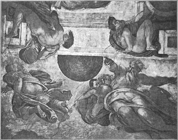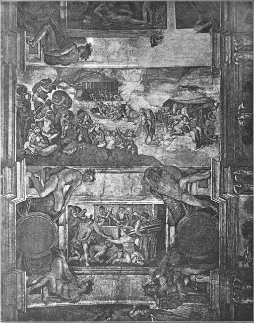 So ist der großartige Inhalt, den Michelangelo den Deckenmalereien gegeben hat, sein ureigenster Gedanke. Er stellte die Vorgeschichte der Erlösung dar: die Schöpfung und den Sündenfall und das weitere Versinken der Menschheit in Sünde; dazu das Hoffen auf den Erlöser, die Vorherverkündigung seiner Ankunft und Vorbedeutungen der Erlösung.