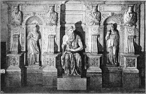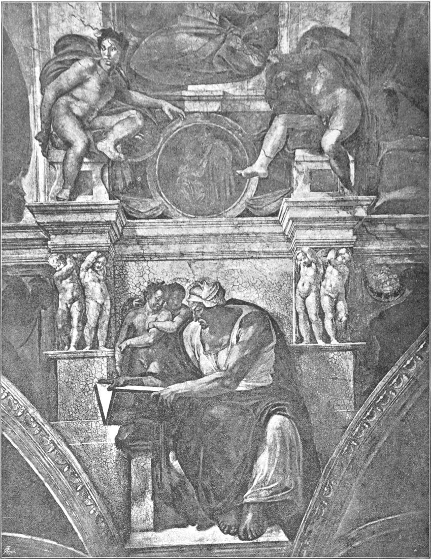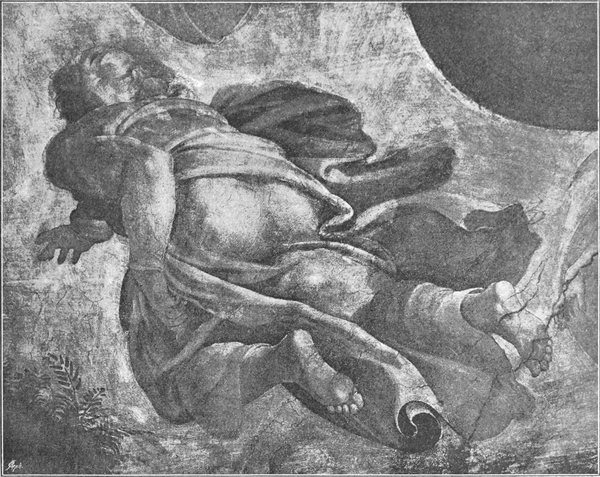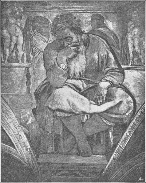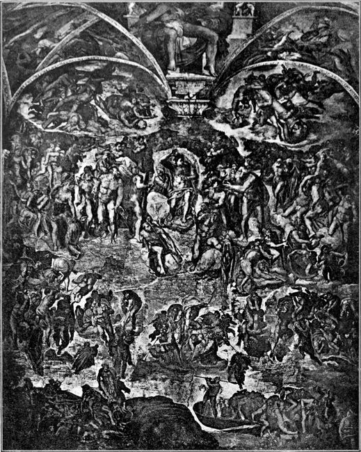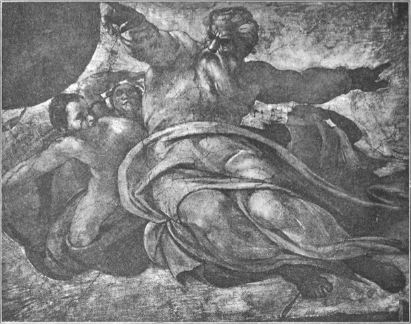 Michelangelo hoffte noch immer auf die Ausführung des Grabmals. Aber vergebens; der Papst bestand unerbittlich auf dem Ausmalen der Decke in der Sixtinischen Kapelle, und dieses Mal beugte sich der Künstler dem eisernen Willen des Herrschers. Mit blutendem Herzen begann er ein Werk, das für ihn den Verzicht auf die Erfüllung seines stolzesten Künstlertraumes bedeutete, und er schuf in diesem Werk das Herrlichste, was die Monumentalmalerei überhaupt hervorgebracht hat, eine Schöpfung so schön und gewaltig, daß die Nachwelt wohl das Recht hat zu glauben, der Meister habe sich hierdurch ein größeres Anrecht auf ihren Dank erworben, als wenn er jenes Riesengrabmal zur Ausführung gebracht hätte.
