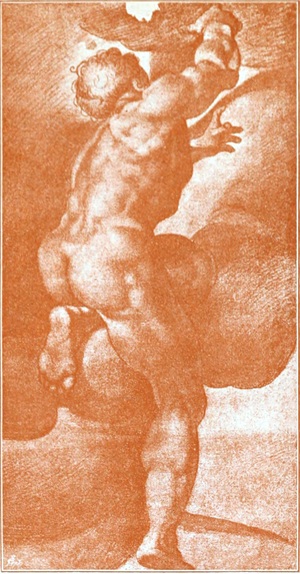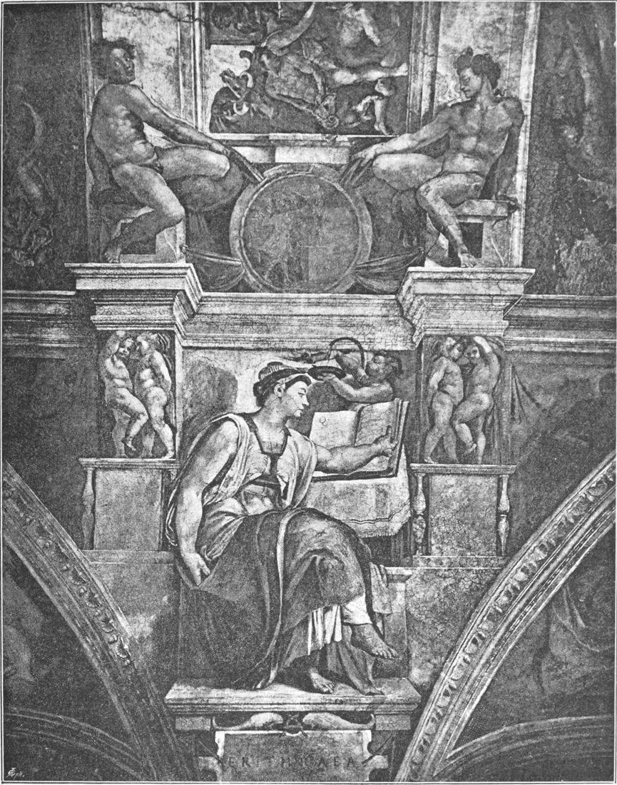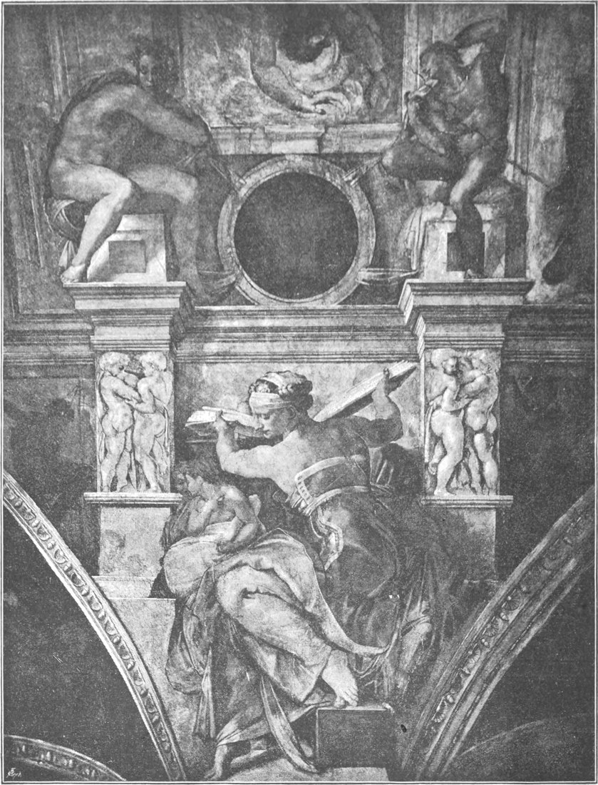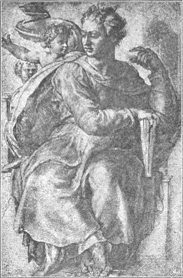 Von den Vorarbeiten zu den Deckenmalereien wissen wir wenig. Über den Verbleib der Kartons gibt es keine weitere Kunde als die, daß Michelangelo 1531 mehrere derselben verschenkte. Das einzige, was von den Vorbereitungen des Meisters zu dem ungeheuren Werk erzählt, sind einige kleine Blättchen mit Federzeichnungen, die sich als die ersten, ganz flüchtig hingezeichneten, aber schon vollkommen sprechenden Skizzen von einzelnen zu jener reichen Gestaltenwelt gehörigen Figuren erkennen lassen, sowie eine nicht gerade große Anzahl von mehr oder weniger durchgebildeten Studienzeichnungen (Abb. 23, 24, 25). Von den in verschiedenen Sammlungen aufbewahrten Zeichnungen, welche Teile der Deckenmalerei in sorgfältiger Ausführung wiedergeben, rührt die größte Zahl nicht von der Hand des Meisters, sondern von lernbegierigen Nachfolgern desselben her; sie sind nach den fertigen Bildern oder zum Teil auch nach den Kartons angefertigt. Doch sind auch diese Kopieen, unter denen sich Blätter von bewunderungswürdiger Ausführung befinden, wohl der Beachtung wert; sie zeigen, welchen Einfluß Michelangelos unvergleichliche Art zu zeichnen auf das mitlebende und das nachfolgende[S. 29] Künstlergeschlecht ausgeübt hat; bei einem Vergleich der Blätter untereinander, wie ihn die nicht hoch genug zu schätzenden Braunschen Photographieen nach den Reichtümern fast aller größeren Sammlungen von Handzeichnungen ermöglichen, ist es interessant zu sehen, wie verschiedenartig bisweilen ein und dasselbe Urbild von Verschiedenen aufgefaßt worden ist.