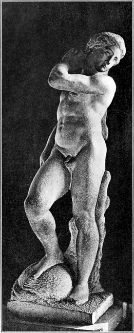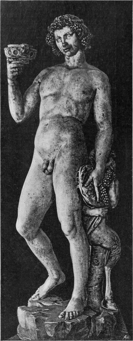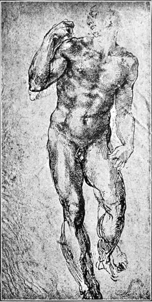Indessen sah sich Michelangelo in der Hoffnung, daß der Kardinal Riario, bei dem er fast ein Jahr lang wohnte, ihm reichliche Beschäftigung geben würde, getäuscht; auch von jener gleich anfangs bestellten Figur ist keine Rede mehr. Die erste Arbeit, welche er in Rom ausführte, war bescheiden genug: der Barbier des Kardinals vergnügte sich damit, in Tempera zu malen, und Michelangelo zeichnete ihm einen heiligen Franciscus auf,[S. 9] den jener dann in Farben setzte; das Bild wurde auf einem Altar der Kirche S. Pietro in Montorio aufgestellt und ist später verschwunden. Mehrere höchst dankbare Aufträge aber, durch deren glänzende Ausführung er in Rom alsbald zur höchsten Berühmtheit gelangte, verschafften ihm die Bekanntschaft mit einem römischen Edelmanne, Namens Jacopo Galli. Dieser bestellte bei ihm zwei lebensgroße mythologische Marmorbilder, einen Cupido und einen Bacchus. Der Cupido hat das Schicksal so vieler Jugendwerke Michelangelos geteilt, er ist verschollen; ob man ihn in einer knieenden Figur mit Bogen und Köcher wiedererkennen darf, welche aus einer italienischen Sammlung in das Kensington-Museum zu London gekommen ist, erscheint fraglich. Der Bacchus aber ist wohlerhalten als das erste ganz unbezweifelte Zeugnis von Michelangelos Kunst, lebensgroße Gestalten aus einem Marmorblock herauszuhauen; er befindet sich im National-Museum zu Florenz. Michelangelo hatte Gelegenheit genug, antike Bacchusbilder zu sehen, und er hat sich auch nach diesen gerichtet, insofern er eine hochgewachsene Jünglingsgestalt mit weichen Formen wiedergab. Aber selbstverständlich konnte und wollte er in dem Gott des Weines keine Gottheit darstellen. Sein Bacchus feiert den Genuß des Weines; er giebt sich mit Behagen der seligen Stimmung des Rausches hin, und eine leichte Gedunsenheit seiner Körperformen verrät, daß er diesen Genuß nicht zum erstenmal kostet; er steht unsicher auf den Füßen, und mit einem Blick, der stier zu werden beginnt, liebäugelt er lächelnd mit dem erhobenen Trinkgefäß in seiner Rechten, während seine Linke in dem Traubenvorrat wühlt, den ein naschender kleiner Faun bereit hält. Dabei bewegt sich die ganze Verbildlichung des Weinrausches, so sprechend sie auch ist, in einer Maßhaltung, wie sie eben nur die Antike lehren konnte (Abb. 7). Daß Michelangelo sich dem mächtigen Eindruck der antiken Kunst, die ihm in Rom viel reicher und viel herrlicher entgegentrat, als in dem Schulgarten zu Florenz, nicht verschloß, daß er namentlich auch von ihr lernte, Kraftfülle mit Ebenmaß zu verbinden, spricht deutlich aus den dieser Zeit angehörigen Studienblättern (Abb. 8).