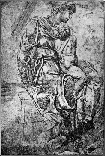 Durch Jacopo Gallis Vermittelung empfing der junge Meister von dem französischen Gesandten in Rom, Jean de Groslaye de Villiers, Abt von St. Denis und Kardinal des Titels von S. Sabina, den Auftrag, eine Pietà — die Mutter Maria mit dem Leichnam Christi — für die Kapelle des französischen Königs in der Peterskirche zu Rom zu meißeln. Der endgültige Vertrag hierüber, der sich noch im Archiv des Hauses Buonarroti befindet, wurde am 26. August 1498 geschlossen; Galli, der denselben für Michelangelo unterzeichnet hat, verspricht darin, daß das Werk so werden solle, wie kein zur Zeit lebender Meister es besser machen könnte. Dieses Versprechen hat Michelangelo voll eingelöst. Er schuf die weltberühmte Gruppe, welche sich, nachdem die Kapelle der französischen Könige durch den Neubau der Peterskirche zerstört worden, in der nach ihr benannten Capella della Pietà dieser Kirche befindet. Ältere Künstler hatten in der Darstellung dieses unzähligemal behandelten Gegenstandes durch eine möglichst herbe Schilderung von Tod und Mutterschmerz ergreifend zum Beschauer[S. 10] zu sprechen versucht. Michelangelo streifte alle Fesseln der Überlieferung ab. Er ließ die Mutter in all ihrem Schmerz die ruhige Schönheit des Antlitzes bewahren. Den Christuskörper bildete er als einen Leichnam, an dessen Totsein niemand zweifeln kann; er benutzte dazu eine Studie, die er nach einer wirklichen Leiche zeichnete (Abb. 9); aber er verklärte den Leichnam mit idealer Schönheit, er schuf eine Gestalt, welcher der Tod seine Merkmale ohne alle entstellenden Züge aufgedrückt hat, die Gestalt eines göttlichen Toten, der gestorben ist, um wieder aufzuerstehen. Durch ein Mittel künstlerischen Gegensatzes hat der Meister es verstanden, die ruhige Schönheit des Leichnams in erhöhtem Maße zur Geltung zu bringen, indem er die Gewänder Marias in tiefen, durch malerischen Wechsel von Licht und Schatten belebten Falten ausarbeitete (Abb. 10). Von den Zeitgenossen nahmen einige, an die realistische Auffassung früherer Meister gewöhnt, an der jugendlichen Schönheit des Madonnengesichts Anstoß; Michelangelo rechtfertigte es mit theologischer Gelehrsamkeit, daß die jungfräuliche Mutter in unvergänglicher Jugend darzustellen sei. In der Pietà der Peterskirche zeigt Michelangelo sich nicht nur frei von dem Herkommen der früheren florentinischen Kunst, sondern er erscheint auch unabhängig von der unmittelbaren Einwirkung der Antike; hier steht er zum erstenmal ganz in seiner selbständigen Künstlerpersönlichkeit da. Gleich als ob ihm selbst dieses zum Bewußtsein gekommen wäre, hat er dieses Werk allein unter seinen sämtlichen Schöpfungen mit seinem Namen bezeichnet. Vasari weiß über diese Namensinschrift ein Geschichtchen zu erzählen: Michelangelo hätte eines Tages gehört, wie in einer Gesellschaft von Fremden, welche das Werk bewunderten, ein Mailänder Bildhauer als der Schöpfer desselben genannt worden sei; daraufhin sei er in der Nacht mit einem Licht hingegangen und habe seinen Namen in das Schulterband der Madonna gemeißelt. In der Folgezeit durfte er mit gerechtem Stolz die Überzeugung hegen, daß niemand mehr seine Schöpfungen einem anderen Urheber zuschreiben würde.