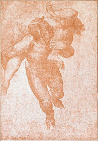 Papst Julius II, der Nachfolger Pius’ III, berief Michelangelo nach Rom, damit derselbe ihm schon bei Lebzeiten ein Grabmal erbaue. Nach nicht allzu langer Zeit einigten sich beide über einen Plan von außerordentlicher Pracht; das Grabmal sollte als ein vierseitiges Gebäude in zwei Geschossen, mit mehr als vierzig überlebensgroßen Marmorfiguren und zahlreichen ehernen Flachbildwerken geschmückt, aufgeführt werden. Michelangelo begab sich alsbald nach Carrara, wo er für 1000 Dukaten Marmorblöcke ankaufte und Verträge über den Transport der gewaltigen Marmormassen abschloß. Er ließ die einzelnen Blöcke an Ort und Stelle im groben zurechthauen, und seine Ungeduld, die es nicht abwarten konnte, bis alle Vorbereitungen zu dem großen Unternehmen, in dem jetzt seine ganze Seele aufging, vollendet waren, trieb ihn, schon jetzt ein paar Figuren für das Grabmal eigenhändig in Arbeit zu nehmen. Acht Monate lang, bis gegen Ende des Jahres 1505, hielten die Arbeiten in den Marmorbrüchen ihn dort fest. Der Anblick der Marmorberge soll den Gedanken in seiner Phantasie erweckt haben, einmal, wenn er Zeit hätte, eine Riesengestalt aus dem lebendigen Fels herauszuhauen, die von weither auf dem Meere sichtbar sein sollte. — Im Anfang des Jahres 1506 wurde der größte Teil der Marmorblöcke in Rom auf dem Petersplatze abgeladen; es sah aus, als ob nicht ein Grabmal, sondern ein Tempel erbaut werden sollte. Ein Haus am Petersplatz war Michelangelo als Werkstatt eingeräumt, welches durch einen Gang mit dem Vatikan verbunden wurde, damit der Papst jederzeit den Meister bei der Arbeit besuchen könnte. So stand Michelangelo im Begriffe, ein Marmorwerk von einem Umfange zu schaffen, wie Rom seit zwölf Jahrhunderten nichts Ähnliches hatte entstehen sehen, ein Werk, das wie kein anderes den Lieblingsgedanken der Renaissancezeit, die Kunst des römischen Altertums fortzusetzen, zu verwirklichen geeignet erschien. Der Boden Roms gab gerade in jener Zeit Schätze an das Tageslicht, welche die antike Bildhauerkunst in noch viel größerer Herrlichkeit zeigten, als ihre bis dahin bekannten Werke. Im Jahre 1506 wurde in der Nähe der Überbleibsel von den Bädern des Titus die Laokoongruppe aus[S. 22]gegraben, und Michelangelo begrüßte sie als „das Wunder der Kunst“, das er von allen Werken des Altertums neben dem berühmten Herkules-Torso am höchsten schätzte. Auch den antiken Dekorationsmalereien, welche in den Bädern des Titus aufgedeckt wurden, hat Michelangelo seine Aufmerksamkeit zugewendet. Ein in der Sammlung Wicar zu Lille bewahrtes Blatt gibt Kunde davon. Auf den beiden Seiten dieses Blattes hat er mit flüssiger Feder, deren Züge das dünne Papier ganz durchdrungen haben, Skizzen niedergeschrieben, die man als Erinnerungen an einige jener kleinen Figurenbildchen erkennt, welche die antiken Zimmermaler in das Formenspiel ihres Zierwerks eingeflochten haben (Abb. 21 und 22).