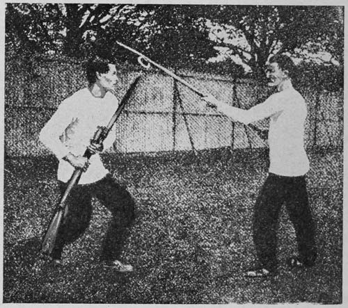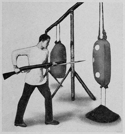 Progression in bayonet training is regulated by obtaining: first, correct positions and good direction; then, quickness. Strength is the outcome of continual practice.