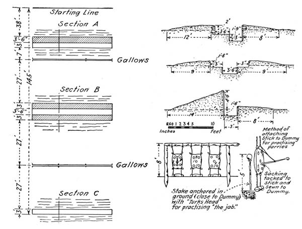 These sack dummies can be made to stand on end by fixing a wooden cross or star (two or three pieces of wood about two inches broad and ¾ inch thick nailed across one another) in the base of the sack before filling it. They can also be placed[Pg 7] with good effect on rough tripods or tied to improvised stools. Dummy sacks should be suspended from gallows and weighted or tethered to the ground from the bottom corners.