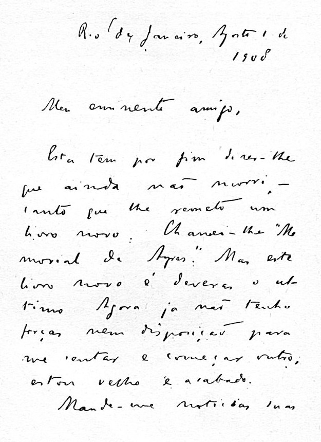 Par son extraordinaire talent d'écrivain et par sa profonde dignité littéraire, par l'unité de sa vie, toute vouée au culte de la beauté intellectuelle, et par le prestige exercé autour de lui par son œuvre et par sa personnalité, Machado de Assis était arrivé, tout en étant le moins bruyant des hommes, le moins enclin à se mettre en évidence, à être considéré et respecté comme le premier des hommes de lettres de son pays, le chef, si cette expression peut répondre à l'idée, d'une littérature jeune, mais qui possède déjà ses traditions et chérit surtout ses gloires. Il ne se montrait toutefois pas avide de louanges, ne se répandait même pas, rivé à ses habitudes, en dehors de son cercle, quoiqu'il fut un excellent causeur, spirituel et, ce qui plus est, attentif. Sa vie était on ne peut plus réglée et tranquille depuis qu'il avait quitté le journalisme actif, car il avait commencé comme tout autre par la chronique parlementaire, les échos du jour et la critique dramatique.