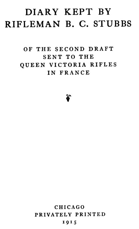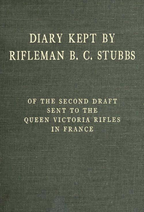 The Project Gutenberg EBook of Diary Kept by Rifleman B.C. Stubbs of the Second Draft Sent to the Queen Victoria Rifles in France, by Bernard Castle Stubbs This eBook is for the use of anyone anywhere in the United States and most other parts of the world at no cost and with almost no restrictions whatsoever. You may copy it, give it away or re-use it under the terms of the Project Gutenberg License included with this eBook or online at www.gutenberg.org. If you are not located in the United States, you'll have to check the laws of the country where you are located before using this ebook. Title: Diary Kept by Rifleman B.C. Stubbs of the Second Draft Sent to the Queen Victoria Rifles in France Author: Bernard Castle Stubbs Release Date: June 23, 2018 [EBook #57381] Language: English Character set encoding: ISO-8859-1 *** START OF THIS PROJECT GUTENBERG EBOOK DIARY *** Produced by Brian Coe, David E. Brown, and the Online Distributed Proofreading Team at http://www.pgdp.net (This book was produced from images made available by the HathiTrust Digital Library.)