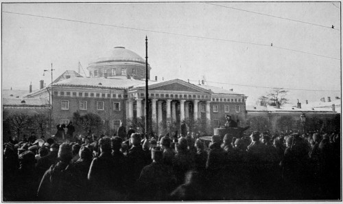 Late that night I stood outside the Tauride Palace, which had become the centre of the revolution. No one was admitted through the great gates without a pass. I sought a place midway between the gates and, when no one was looking, scrambled up, dropped over the railings, and ran through the bushes straight to the main porch. Here I soon met folk I knew—comrades of student days, revolutionists. What a spectacle within the palace, lately so still and dignified! Tired 3 soldiers lay sleeping in heaps in every hall and corridor. The vaulted lobby, where Duma members had flitted silently, was packed almost to the roof with all manner of truck, baggage, arms, and ammunition. All night long and the next I laboured with the revolutionists to turn the Tauride Palace into a revolutionary arsenal.
