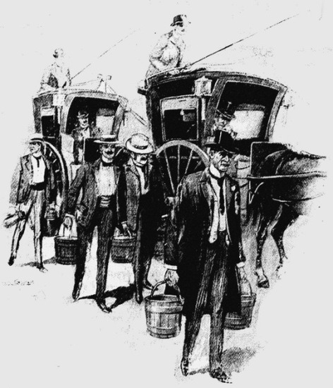 Whatever way they went the same story assailed them. The stereotyped reply was given at King's Cross, Euston, St. Pancras and in the Caledonian Road. The situation had suddenly grown dangerous and critical. The sullen, grotesque stream flowed back westward with a headway towards Trafalgar Square. A good many sheepskins were worn, for Gough's idea had become popular.