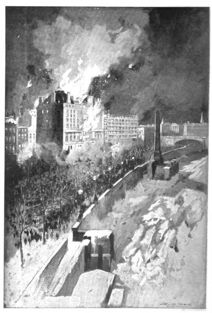 After dark, the passage from one main road to another was a real peril. Belated stragglers fought their way along their own streets without the slightest idea of locality, the dazzle of the snow was absolutely blinding. In sheltered corners the authorities had set up blazing fires for the safety of the police and public. Hardly a vehicle had been seen in the streets for hours.