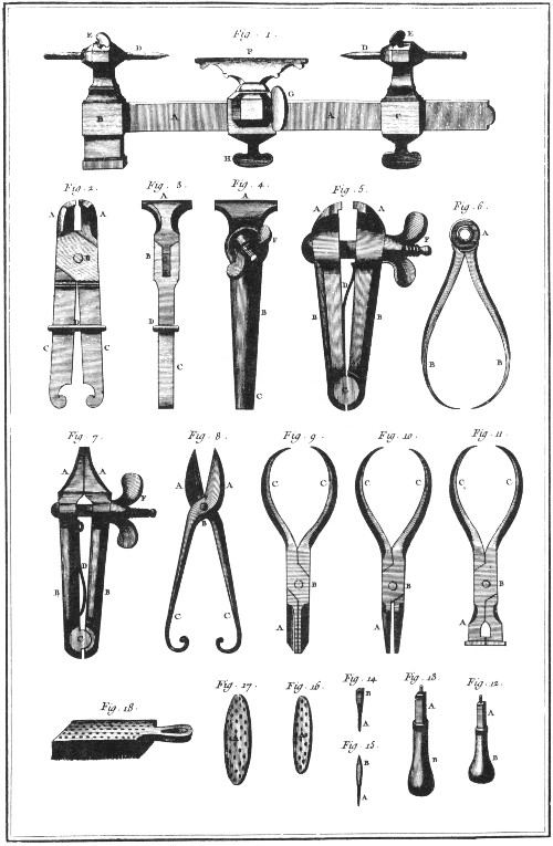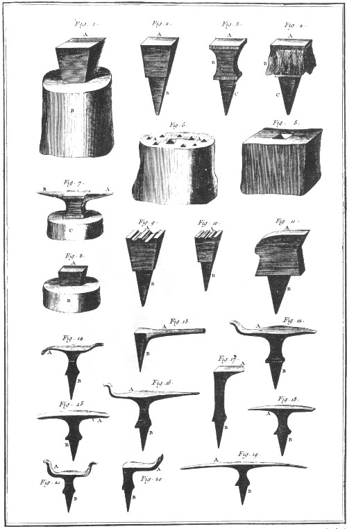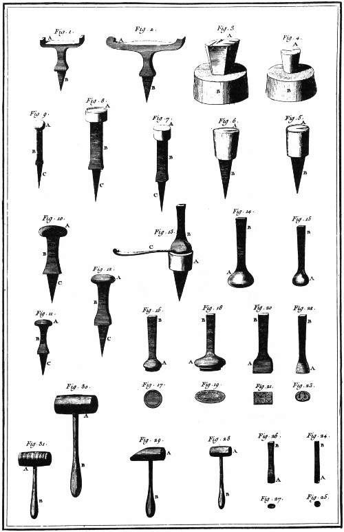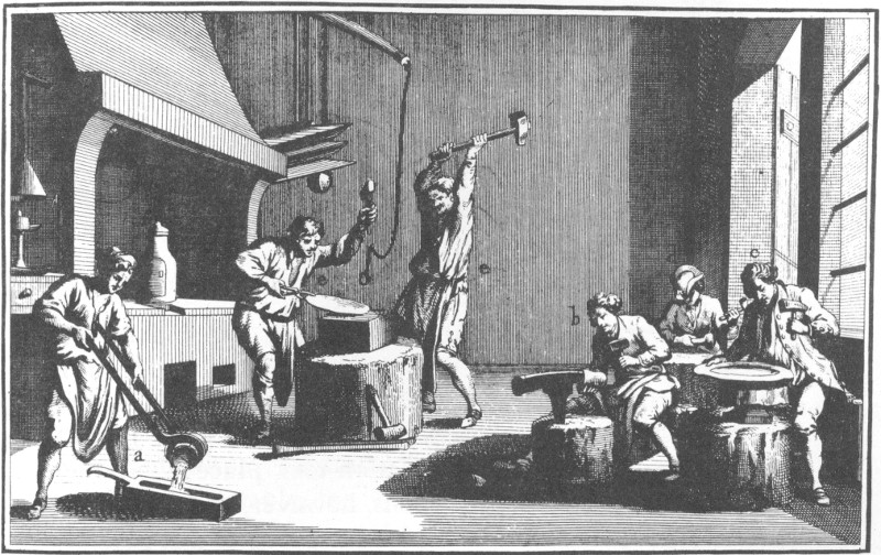 This is a shop where smaller pieces were made. We would refer to it as a jewelry shop. The workmen are shown melting the metal, hammering on an anvil, soldering with a mouth blow pipe, and setting the stones. DIDEROT.