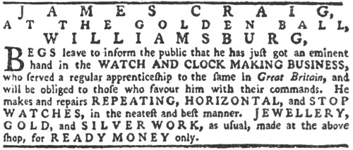 WILLIAMSBURG,BEGS leave to inform the public that he makes and sells all sorts of GOLD, SILVER and JEWELLERY WORK, after the newest fashions, and at the lowest prices, for ready money only. Those who are pleased to favour him with their commands may depend upon having their work done in the neatest manner, and on the shortest notice; and their favours will be most gratefully acknowledged.... He gives the highest prices for old GOLD, SILVER, or LACE, either in cash, or exchange.... Commissions from the country will be carefully observed, and punctually answered.