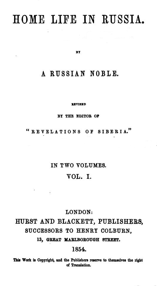With these preliminary remarks, the Editor begs to offer "Home Life in Russia" to the English reader, as a worthy companion to the "Revelations of Siberia," and as adding one more to our scanty list of books which throw light upon the domestic life of our 'ancient allies' and present foes.