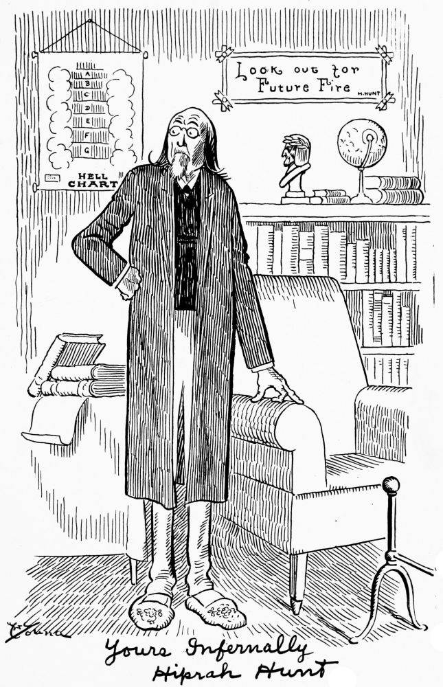 Despite “higher criticism” he continually and earnestly advocates the justice of future punishment, and for this reason is known in the town where he lives as “Hell-fire Hunt.”