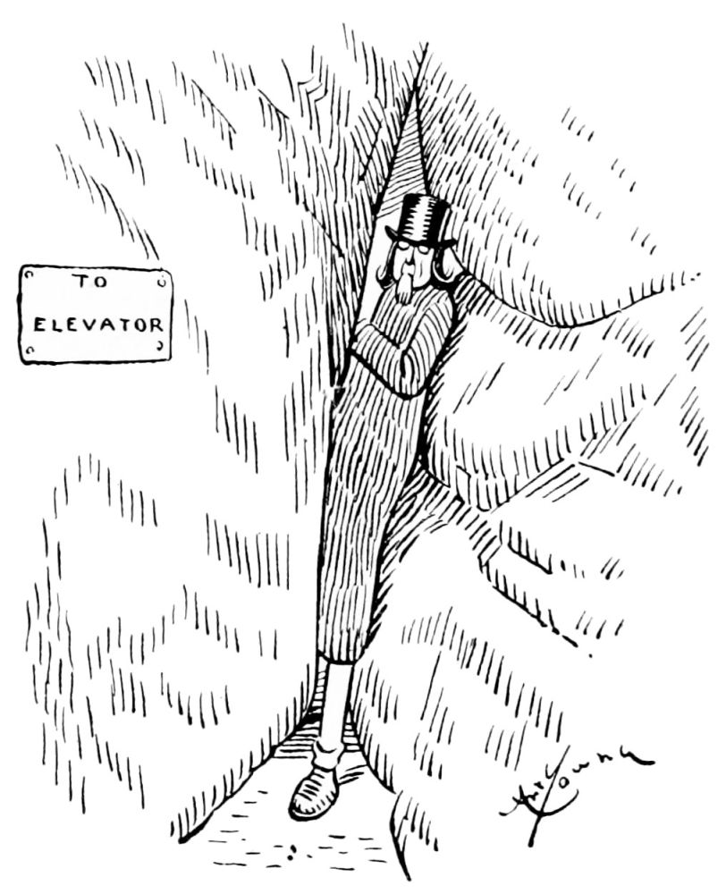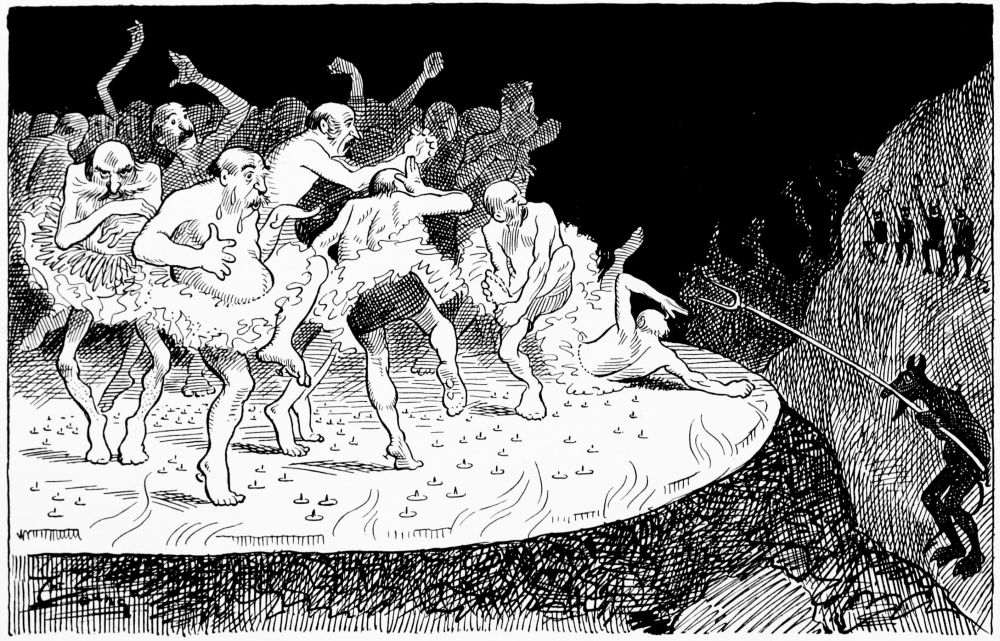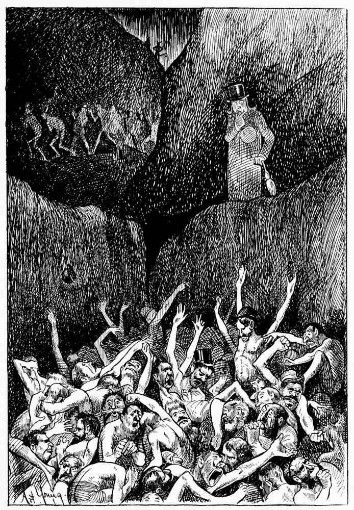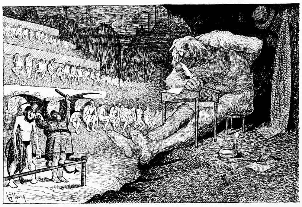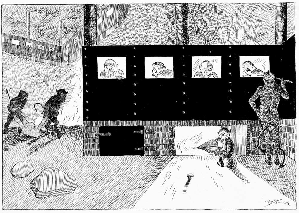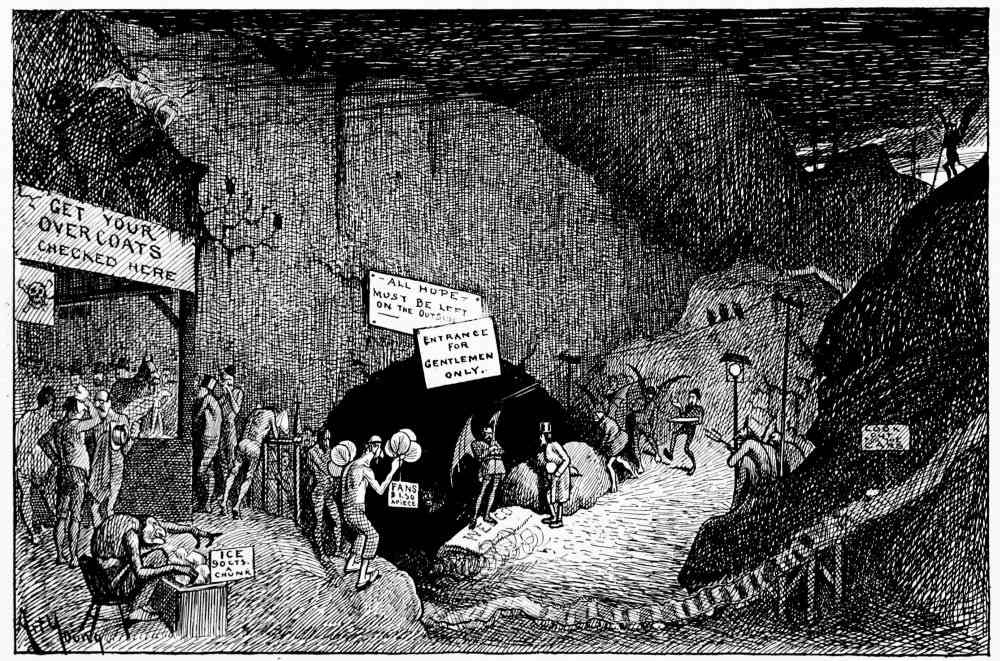 Hiprah Hunt is at the American entrance to Hell. He stands amidst a throng of Demons, sinners and employees of the realm. Crowds of men are getting overcoats checked and buying fans. He buys one himself, and also secures a guide book, locating the different sections and departments. He sees over the portal’s lofty arch the words “Leave all hope on the outside.” This demand he will not entirely accede to. He retains a little, thinking he may need it later on.