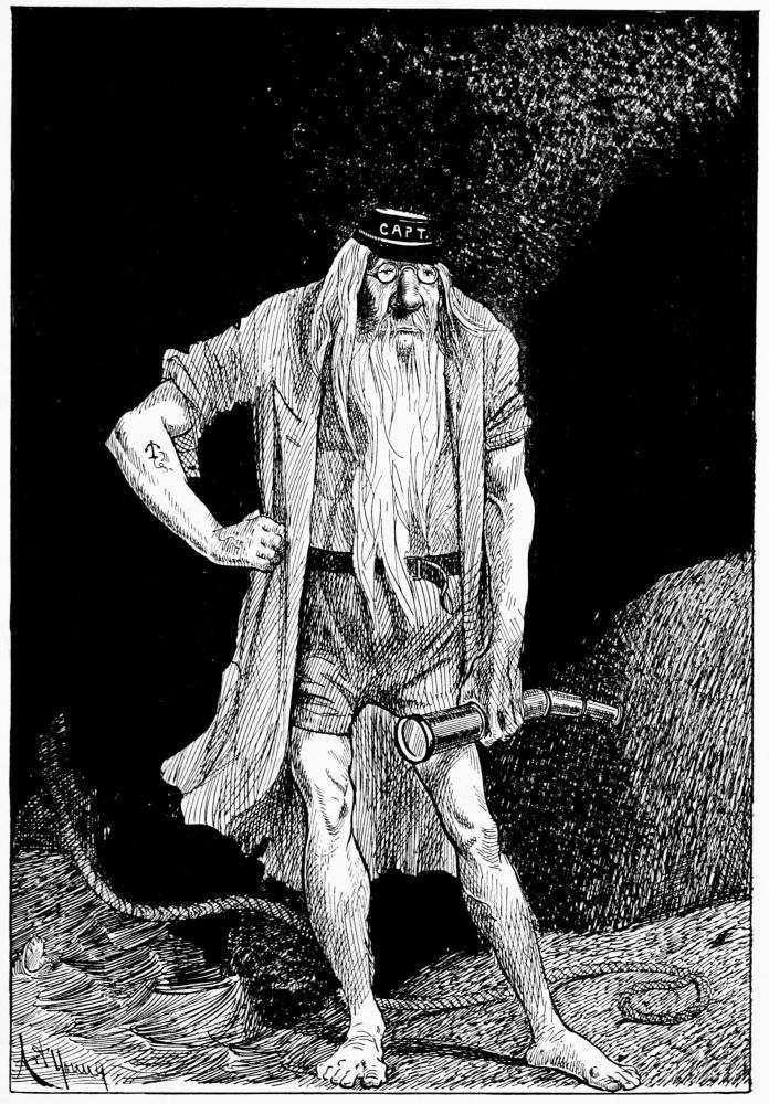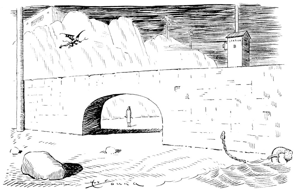 Mr. Hunt sees Charon’s boat take on a load of passengers. He watches it pull out from the pier and cross the river. An orchestra, consisting of a bass horn and an accordion, supplies the torture on the run from shore to shore. Wearing nothing but a mackintosh and gaiters the Captain stands on the roof of the pilot house grimly scanning the black waves.