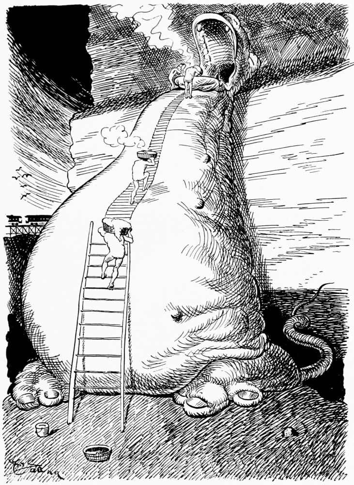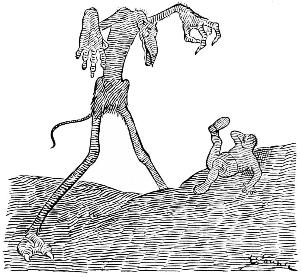 Coming into the second district Mr. Hunt is debating which way he shall proceed, when he hears a scuffling on the heated asphalt road behind him. He turns and sees passing a drove of human-footed sheep, led by a monkey, whose contortions they are compelled to imitate. Mr. Hunt consults his guide book and learns that these are the people who did things because others did them, never taking the trouble to think for themselves.