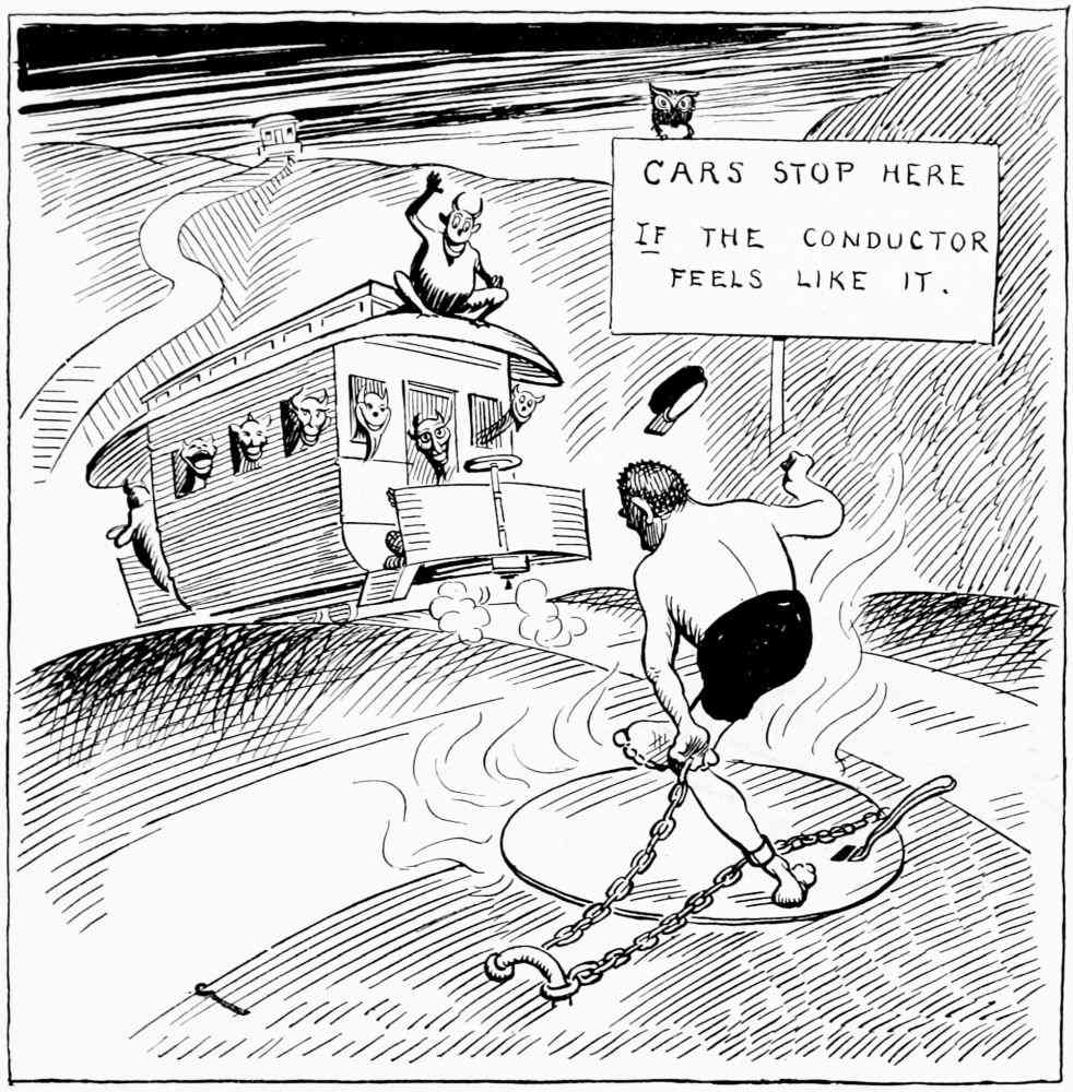 Tired and confused with the busy scenes and active incidents of the day, he is returning by night train to his home. As usual, when traveling, he reads his Divine Comedy. He has not read far when he is overcome by a sense of drowsiness. Sleepily, he reviews the events of the day in the bustling city while musing over the grewsome scenes in his book. What with the thoughts of high buildings, cable cars, of arch-heretics in their fiery tombs, slot machines, automobiles and gibbering ghosts, of swift-running elevators and headless spirits, of well-dressed gamblers and “Adam’s evil brood” at large, his mind is truly in a chaotic state.