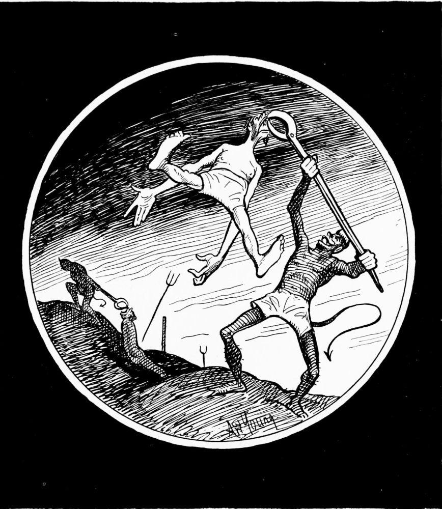 “As a cat clings to a tree trunk,” says the poet, “while dogs dance ’round with laughing tongues,” so this malefactor hangs high up a spike-covered pole, while “fiends make merry at his sorry plight.”