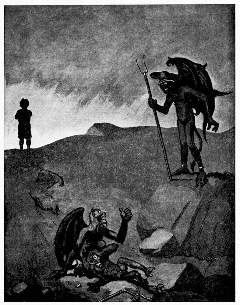 The explorer now determines to find Satan. To avoid the difficulties that Dante met with, it is Mr. Hunt’s purpose to get a permit to pass through the Empire from the Devil himself. Though Demons pursue him with persistency he succeeds in reaching a huge arched entrance in an immense purple rock. Over it is a blazing inscription reading: “Satan’s office.” Here Mr. Hunt pauses. For a moment he is afraid. He regains his courage, and, mounting an elaborate fire-escape, enters. “As a night-hawk cleaves a side flight in the sky,” says the poet-explorer, “so the great arch-enemy of mankind wheeled round in his chair as I entered.”