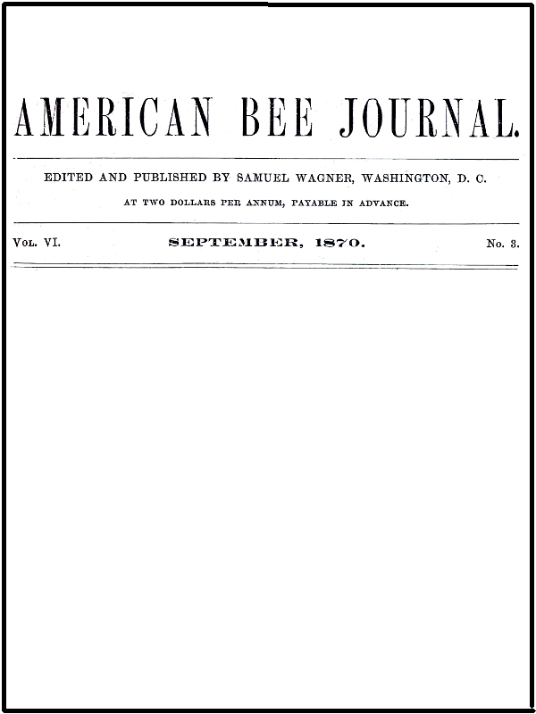 The Project Gutenberg EBook of The American Bee Journal, Volume VI, Number 3, September 1873, by Various This eBook is for the use of anyone anywhere in the United States and most other parts of the world at no cost and with almost no restrictions whatsoever. You may copy it, give it away or re-use it under the terms of the Project Gutenberg License included with this eBook or online at www.gutenberg.org. If you are not located in the United States, you'll have to check the laws of the country where you are located before using this ebook. Title: The American Bee Journal, Volume VI, Number 3, September 1873 Author: Various Editor: Samuel Wagner Release Date: October 27, 2018 [EBook #58178] Language: English Character set encoding: UTF-8 *** START OF THIS PROJECT GUTENBERG EBOOK AMERICAN BEE JOURNAL, SEPTEMBER 1873 *** Produced by Wayne Hammond and The Online Distributed Proofreading Team at http://www.pgdp.net (This file was produced from images generously made available by The Internet Archive)