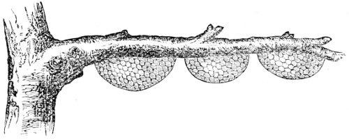 “I have seen three together as above, and they are often four feet in diameter. The natives of Timor I have seen take them. They climb up a tree carrying a smoke torch made of a split creeper bound up in palm leaves, and hanging by a rope from their waist. They cover up their body and hair carefully, but their arms and legs are bare. The smoke directed on the comb makes the bees fly off in a cloud as the man approaches. He sweeps off the remainder with his hand and then cuts off the comb with a large knife, and lets it down to his companions below by a thin cord. He is all the time surrounded by a cloud of bees, and though the smoke no doubt partly stupefies them, he must be severely stung. While looking on from a considerable distance a few came down and attacked me, and I did not get rid of them till I was half a mile from the place and had caught them all, one by one, in my insect net. The sting is very severe. I should imagine that in Timor the dry season answers to our winter, as the drought is very severe and much of the foliage is deciduous. Eucalypti are the most common trees, and their flowers I suspect supply the bees with their honey. In Borneo combs are placed in a somewhat similar manner, perhaps formed by the same species. The only bee I have seen domesticated in the East is one at Malacca, the natives hang up bamboos and hollow logs for it, but it is, I believe, not a true Apis, as it makes clusters of large oval shells of black wax.”